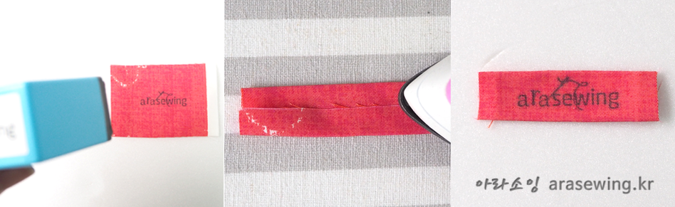 무늬 없는 쪽으로 골라 스탬프를 찍고 라벨을 만들어 지그재그 스티치로 촘촘하게 달았다.