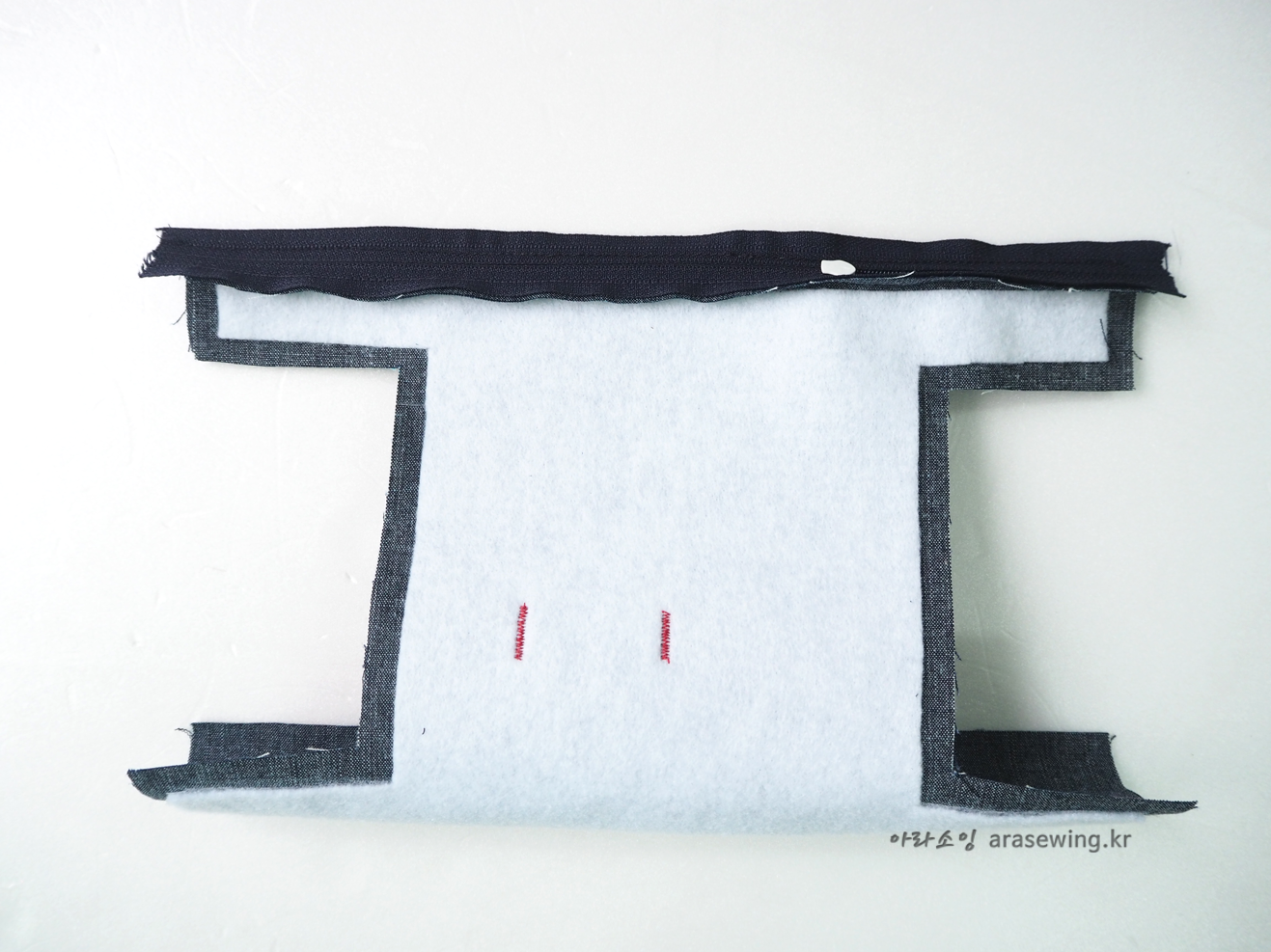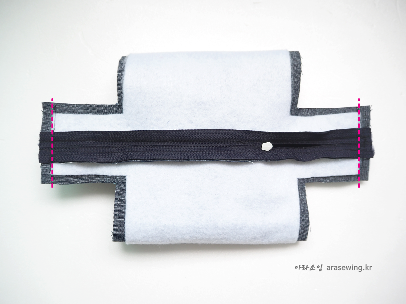2. 지퍼 슬라이더를 닫히면 왼쪽으로 가도록 하고 겉감에 박음질합니다.