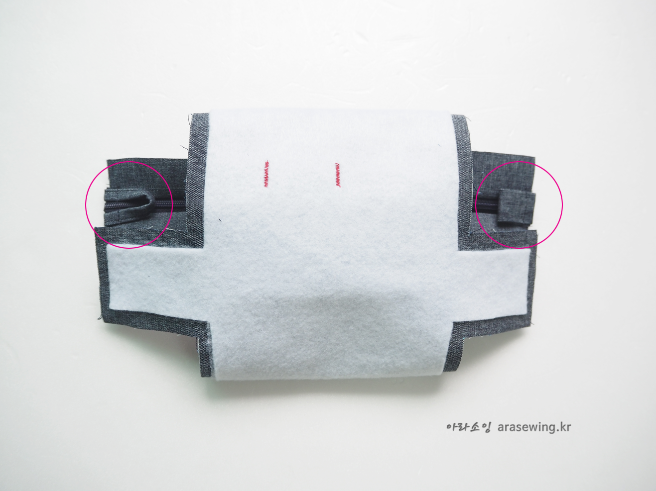 4. 겉감 쪽에 양쪽에 들어갈 고리를 고정시킵니다. (사각 파우치는 요게 없으면 불편해요~)