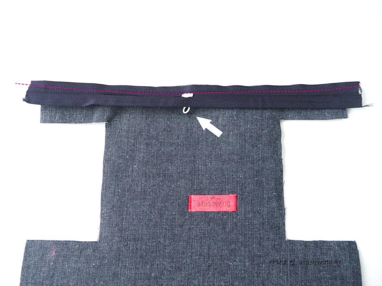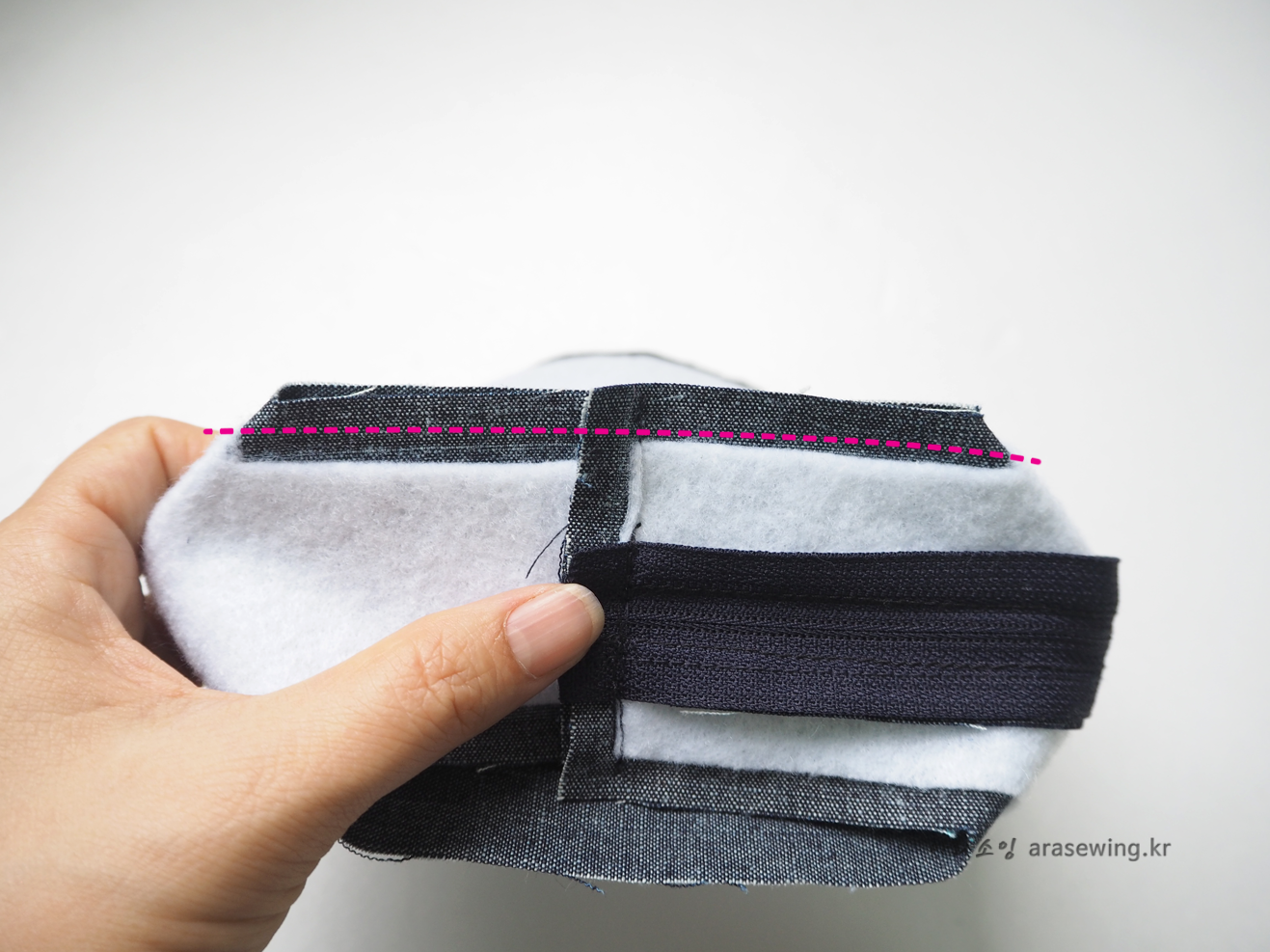 2. 지퍼 슬라이더를 닫히면 왼쪽으로 가도록 하고 겉감에 박음질합니다.