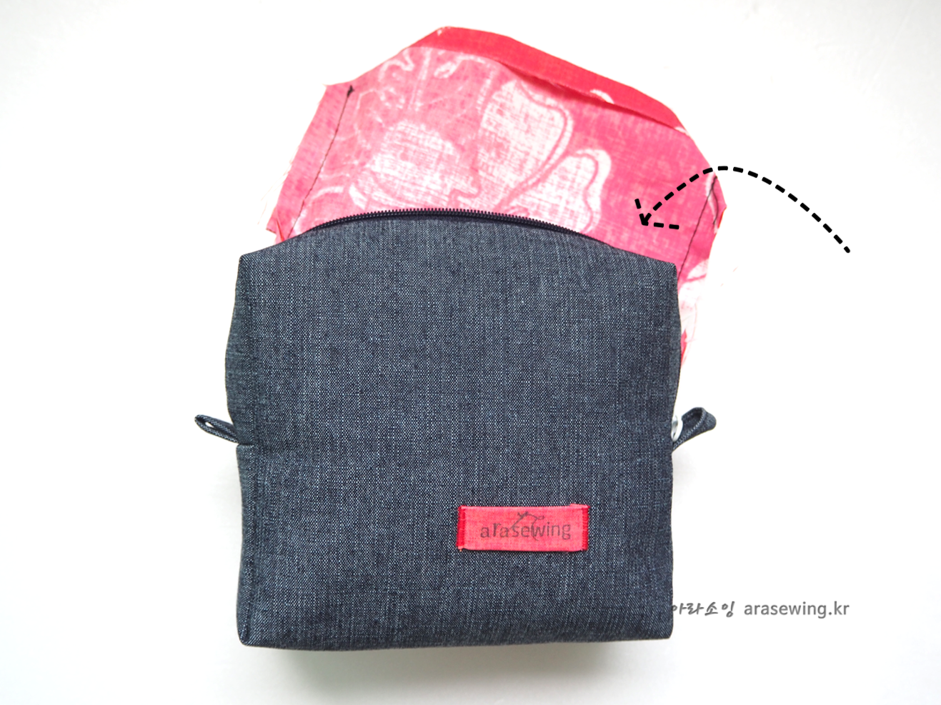 4. 겉감 쪽에 양쪽에 들어갈 고리를 고정시킵니다. (사각 파우치는 요게 없으면 불편해요~)