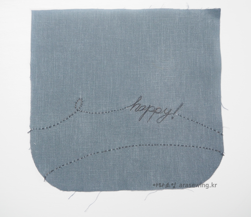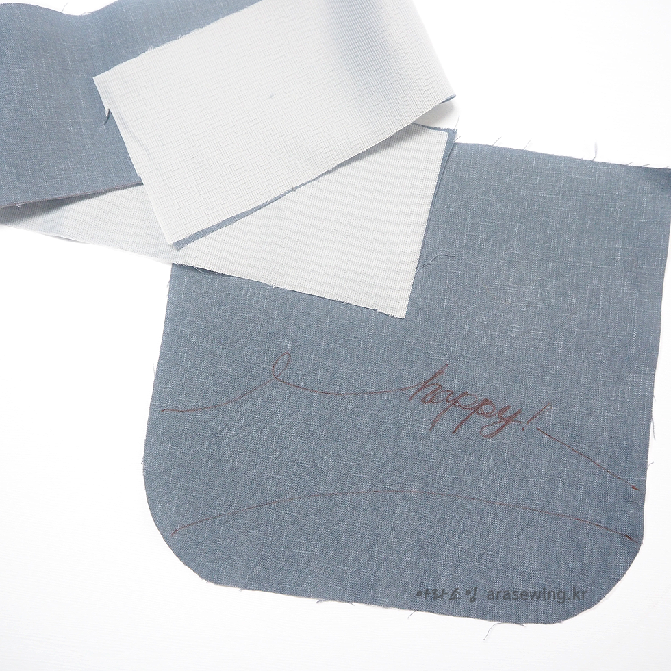 겉감에는 리넨의 구겨짐은 느끼고 싶어서 심지를 붙이고 싶지 않았지만, 사이즈가 작다 보니 불편 할것 같아서 부드러운 실크 접착심지를 붙였어요. 앞면에 자수로 꾸밀 그림이나 문구를 펜으로 그립니다.)이 부분은 원하는 대로 바꾸면 되겠죠?)