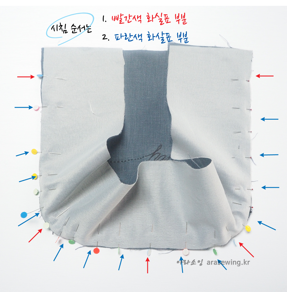 겉면에 옆면의 겉 끼리 보게 하고 시침합니다. 이렇게 직선과 곡선을 동시에 박음질해야 하는 경우는 특히 시침할 때는 큰 등분에서 작은 등분으로 점차 좁혀가야 박음질이 끝났을 때 길이가 어긋나지 않아요