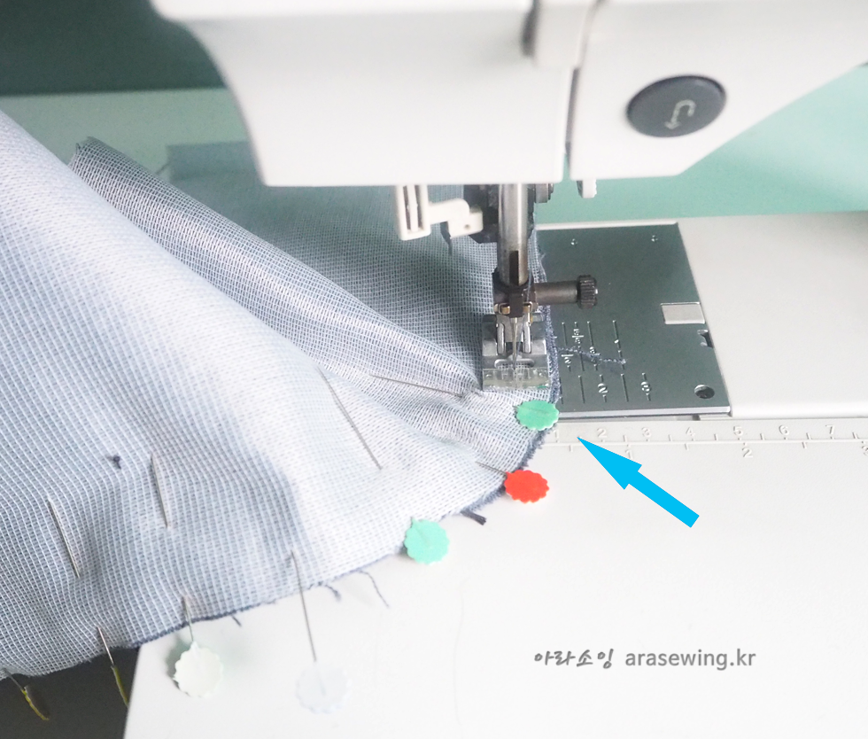 박음질할 때는 여분이 남게 되는 옆면이 위로 오게 하여서 손으로 조절해가며 합니다.