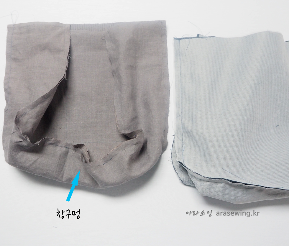 안감(회색) 원단에는 밑에 창구멍을 남기고 박음질합니다. 2장을 다 만들었습니다. 이제 합체해야겠지요?