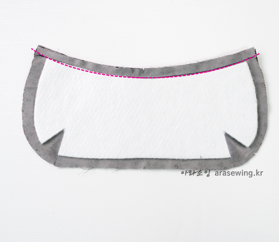 이 작업하면서 실수한 것이 요 다아트를 깜박하고 빠트렸어요 (원래 순서로는 재단하고 심지 붙이고, 다아트 작업하면 됩니다.) 다아트 들어가는 부분을 박음질해서 입체감을 줍니다.