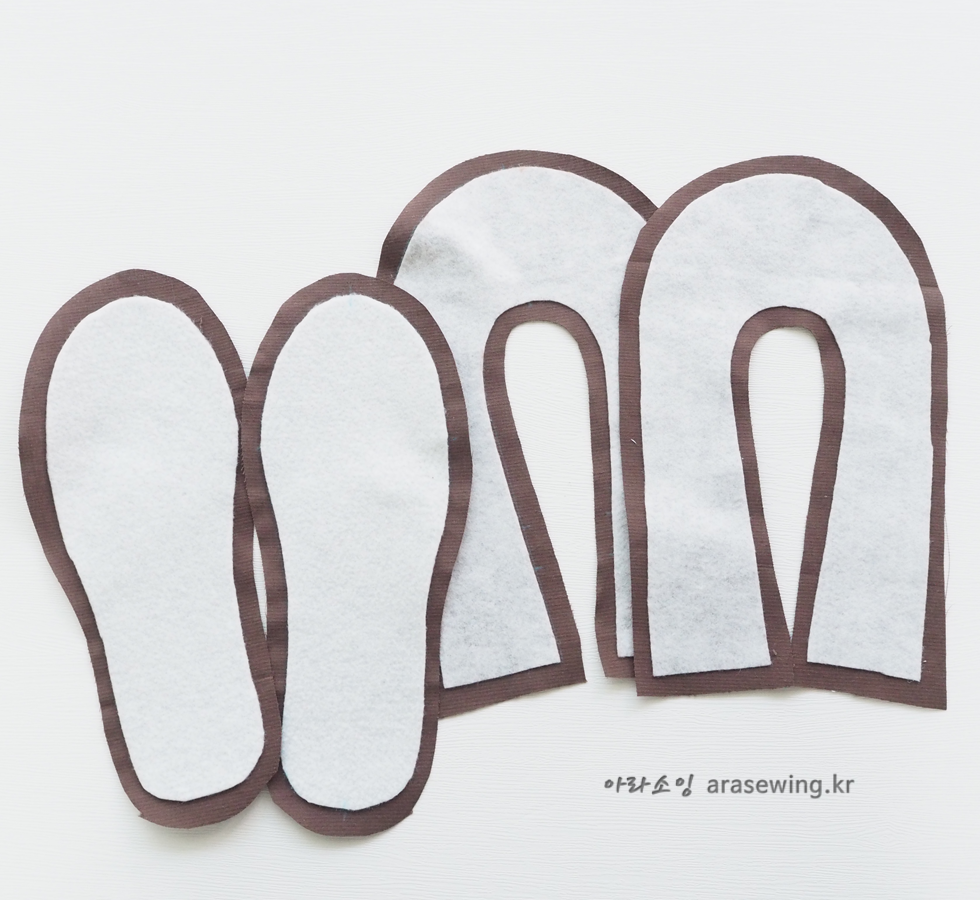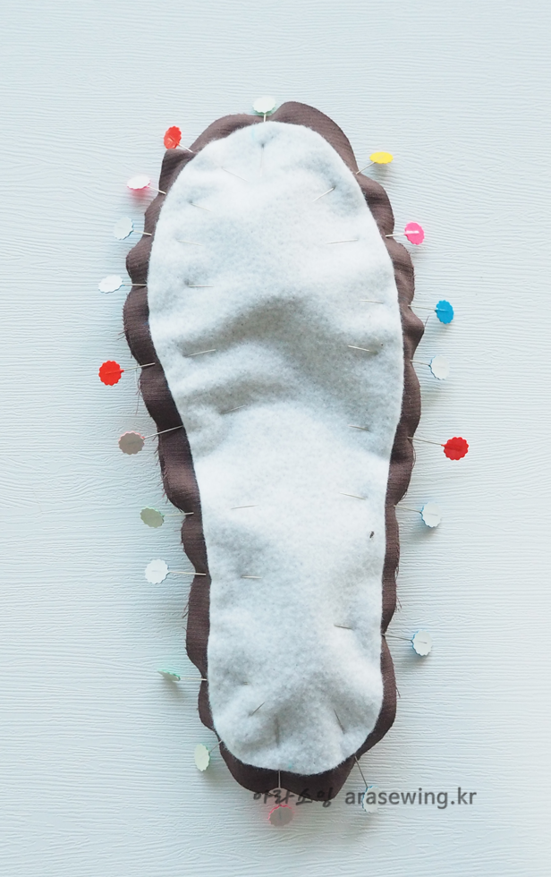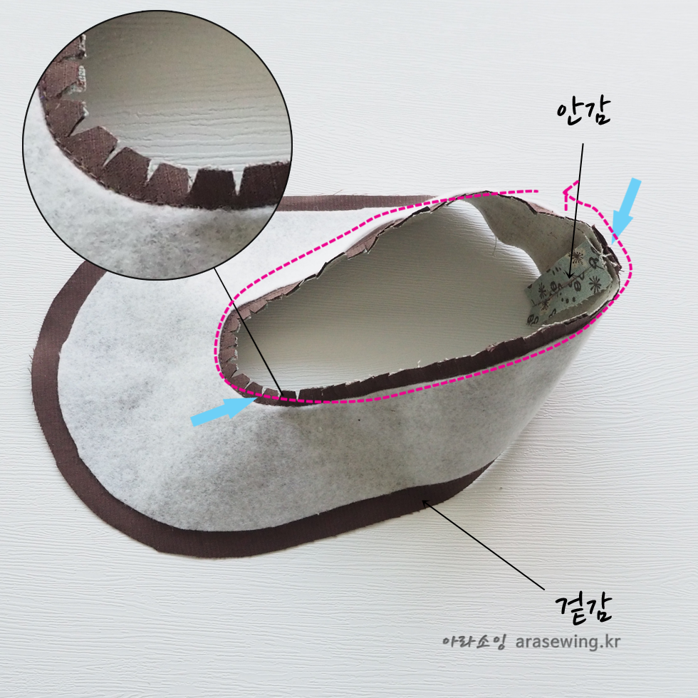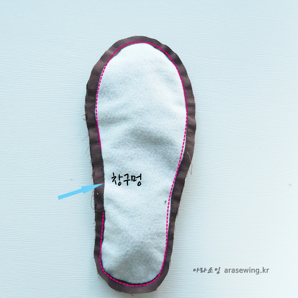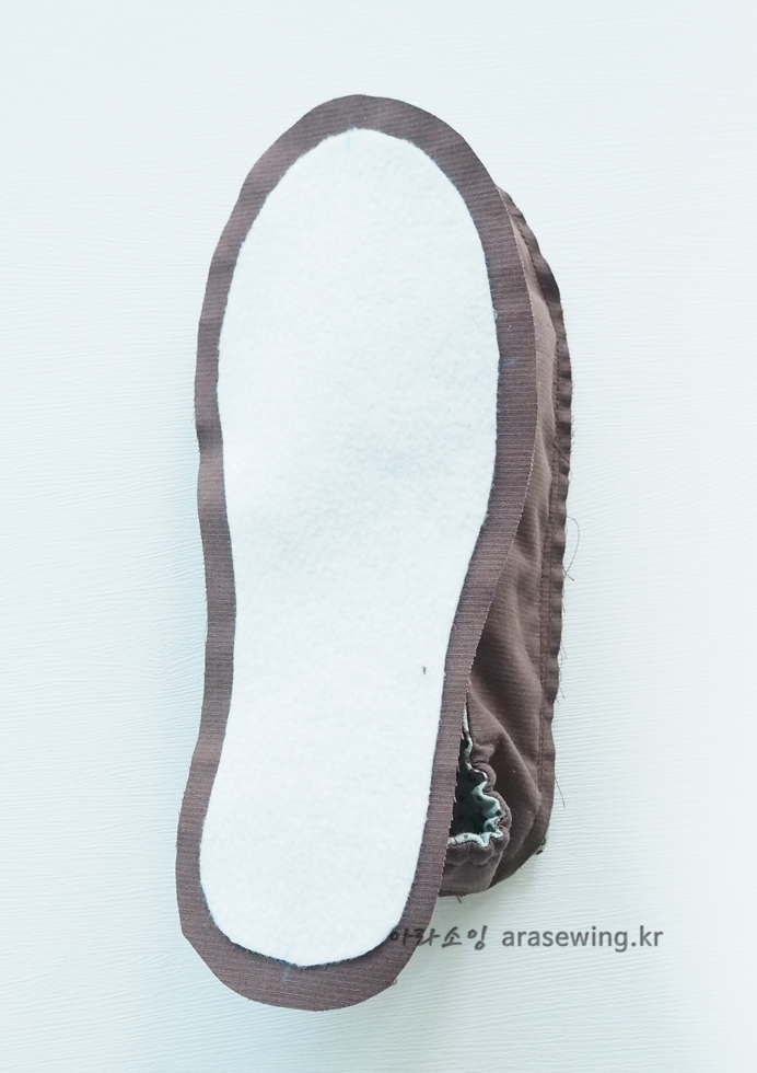 (특히 앞 발가락쪽은 접착솜이 같이 박음질이 되지 않도록 조심합니다. 솜이 같이 박음질 되면 박음선 부분이 두꺼워지면서 신었을 때 불편해집니다. )
