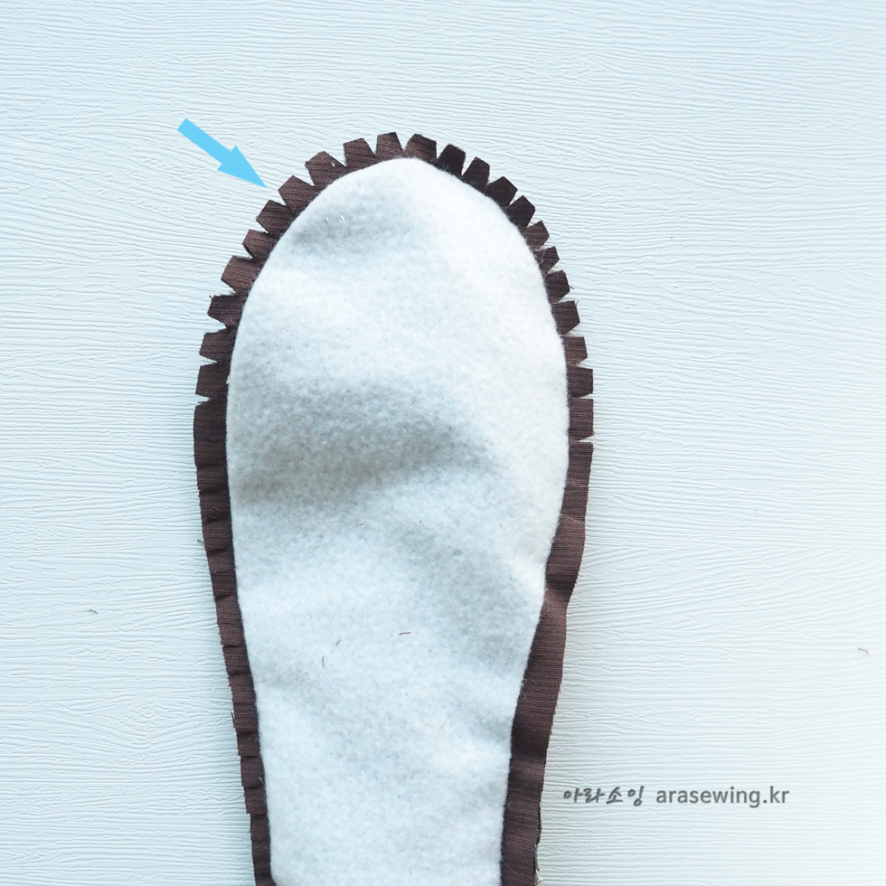 12. 시접을 0.7cm 로 잘라내고 전체적으로 가윗밥을 줍니다. 이때 곡선이 심한 부분은 삼각형으로 가윗밥을 줍니다. (이 부분은 정성 들여서 해야 해요 대충 하면 시접이 뭉쳐서 신었을 때 앞쪽이 불편할 수 있어요.)