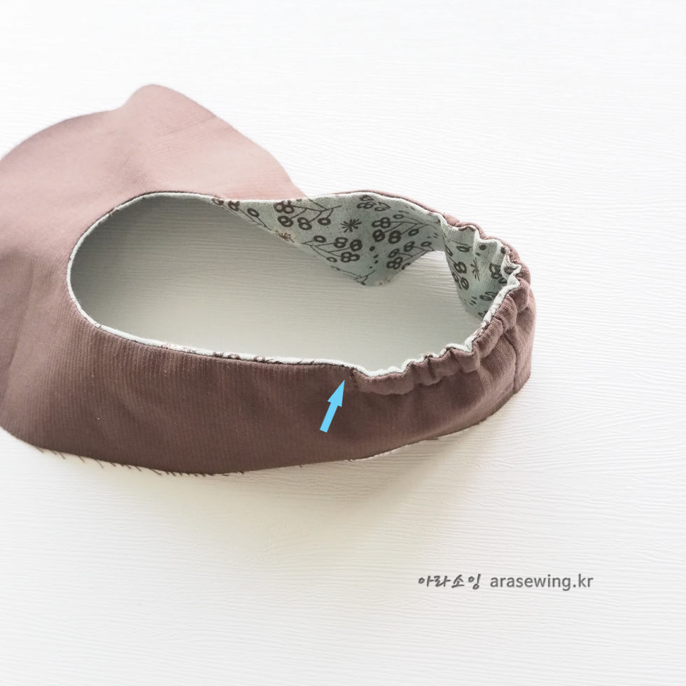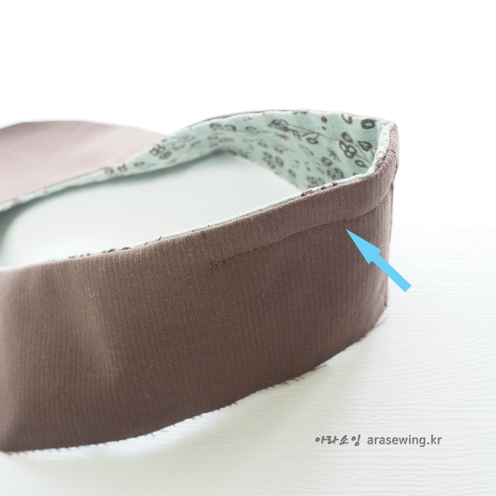 8. 겉감과 안감을 잘 맞춰서 완성선 바깥쪽으로 2장이 어긋나지 않게 큰땀으로 시침 박음질을합니다(임시 고정하는 과정)