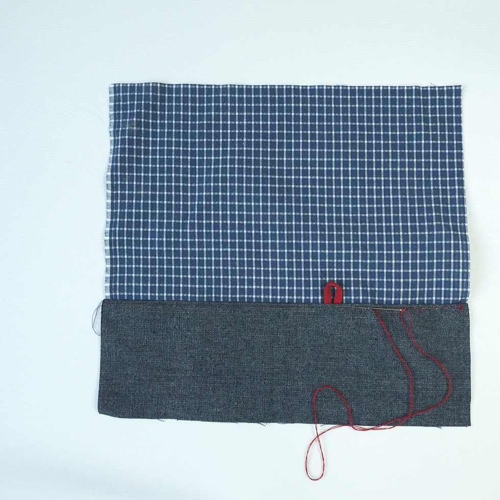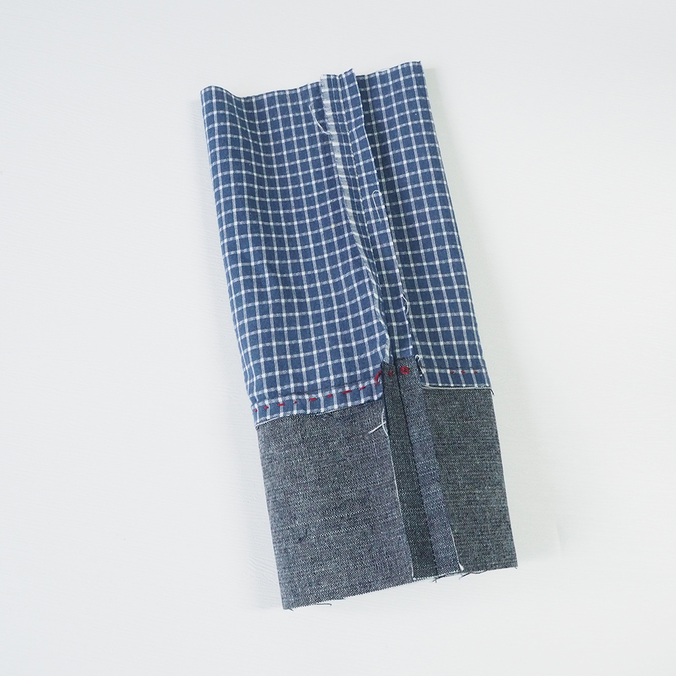 겉감의 윗부분과 배색을 연결해서 준비하고 장식 스티치를 한다.