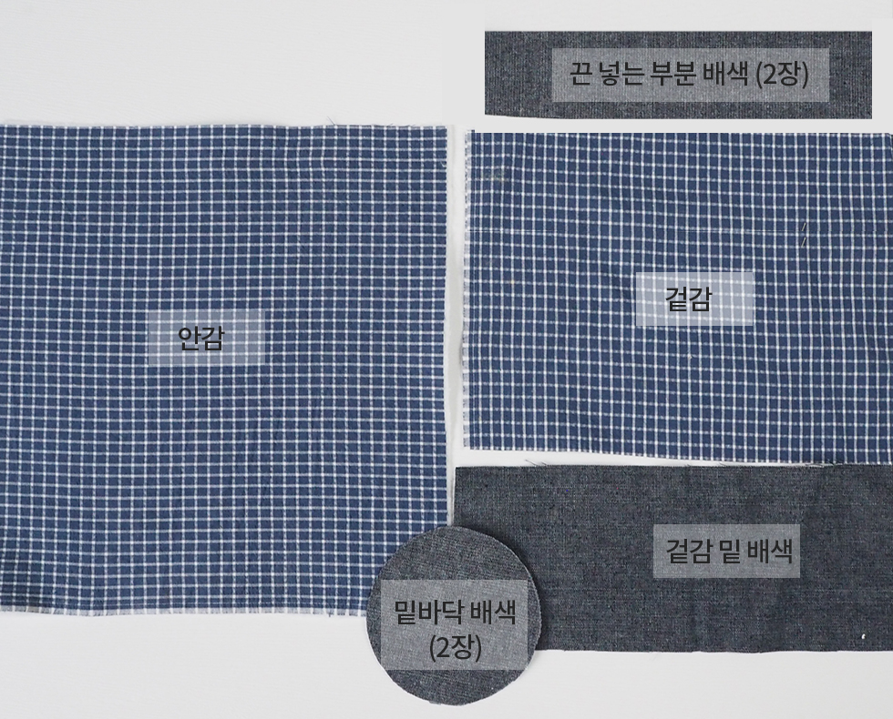 끈 들어갈 배색감을 겉감의 겉에 고정한다. (이 부분은 원통 만들기 전 과정에서 해도 된다)