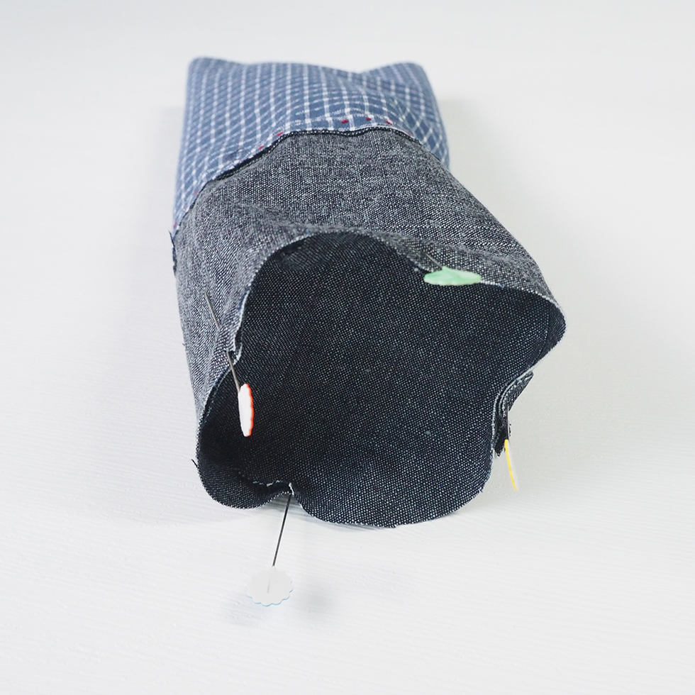 겉감의 원통 안에 안감을 넣어서 입구를 박음질한다.