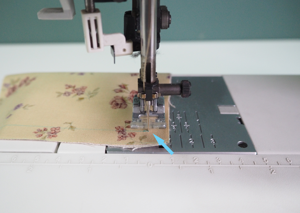 노루발을 올리고 바늘을 내려서 시작점을 잡습니다. (재봉기에 따라서 바늘 위치를 멈췄을 때 내리는 위치 버튼이 있다면 사용하세요.) 시작할 때는 후진 버튼을 눌러서 몇 땀 박음질하고 다시 앞으로 직선 박기를 합니다. 이렇게 하면 박음질이 풀리지 않겠죠? 재봉기에 따라서 마무리 버튼이 있다면 이걸 사용하시면 됩니다.