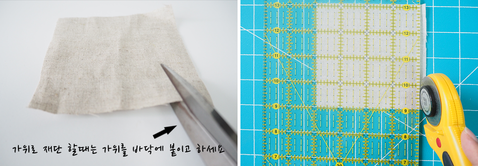 재단을 가위를 이용해서 할 때는 가위를 바닥에 대고 해야 정확히 할 수 있습니다.