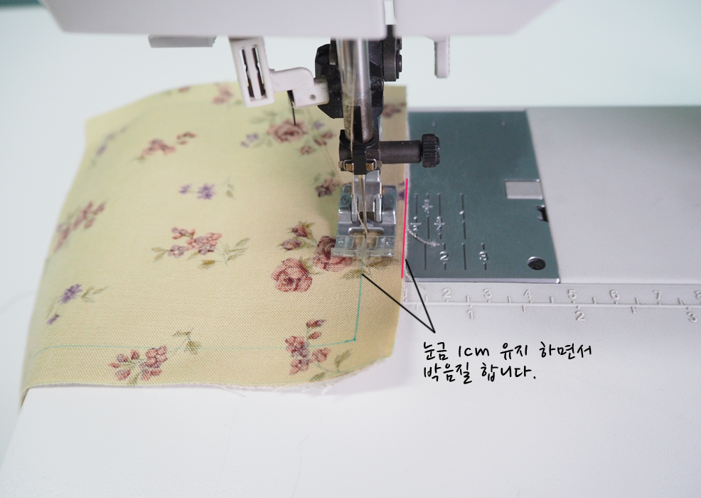 박음질해서 모서리까지 오면 바늘을 꽂은 상태에서 노루발을 올리고