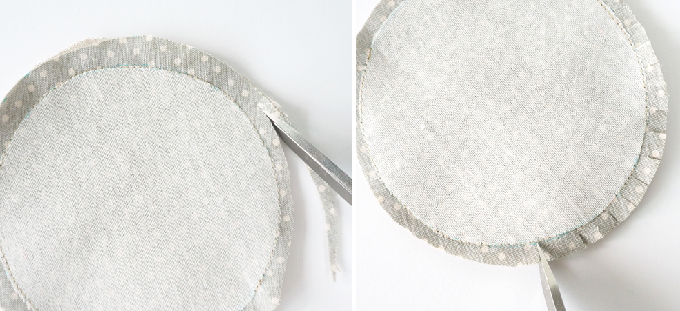 박음질이 끝나면 역시 시접 정리해주고요. (곡선은 특히 더) 가윗밥을 줍니다.