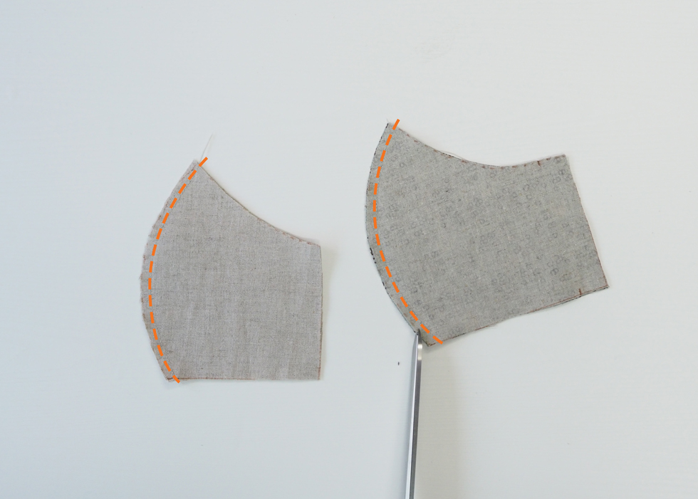 4. 겉감의 겉끼리, 안감의 겉끼리 대고 중심 부분을 박음질하고 가윗밥을 줍니다.
