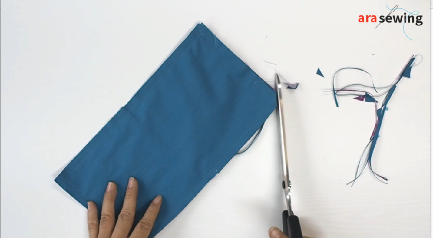 시접을 0.7cm 정도로 잘라내고 모서리 부분은 잘라줍니다.