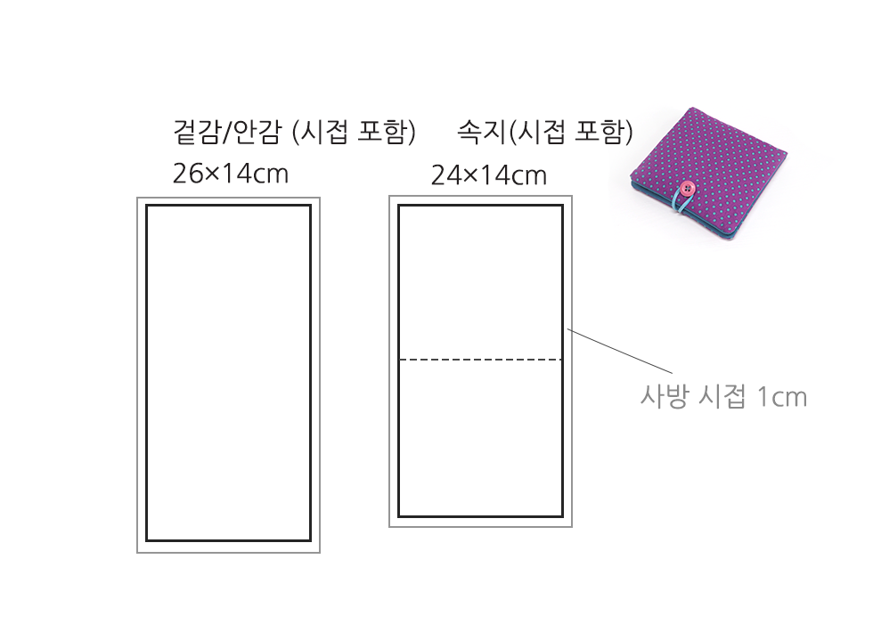 접착솜(24㎝ × 12㎝)을 겉감에 붙이고 다림질로 붙인 다음 사방 1cm 시접을 주어서 겉감 (26㎝ × 14㎝ 1장 (시접 포함))을 재단하고 안감, 속지 등도 재단합니다.