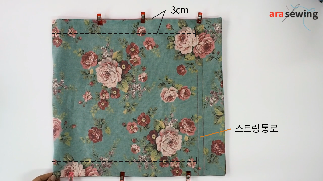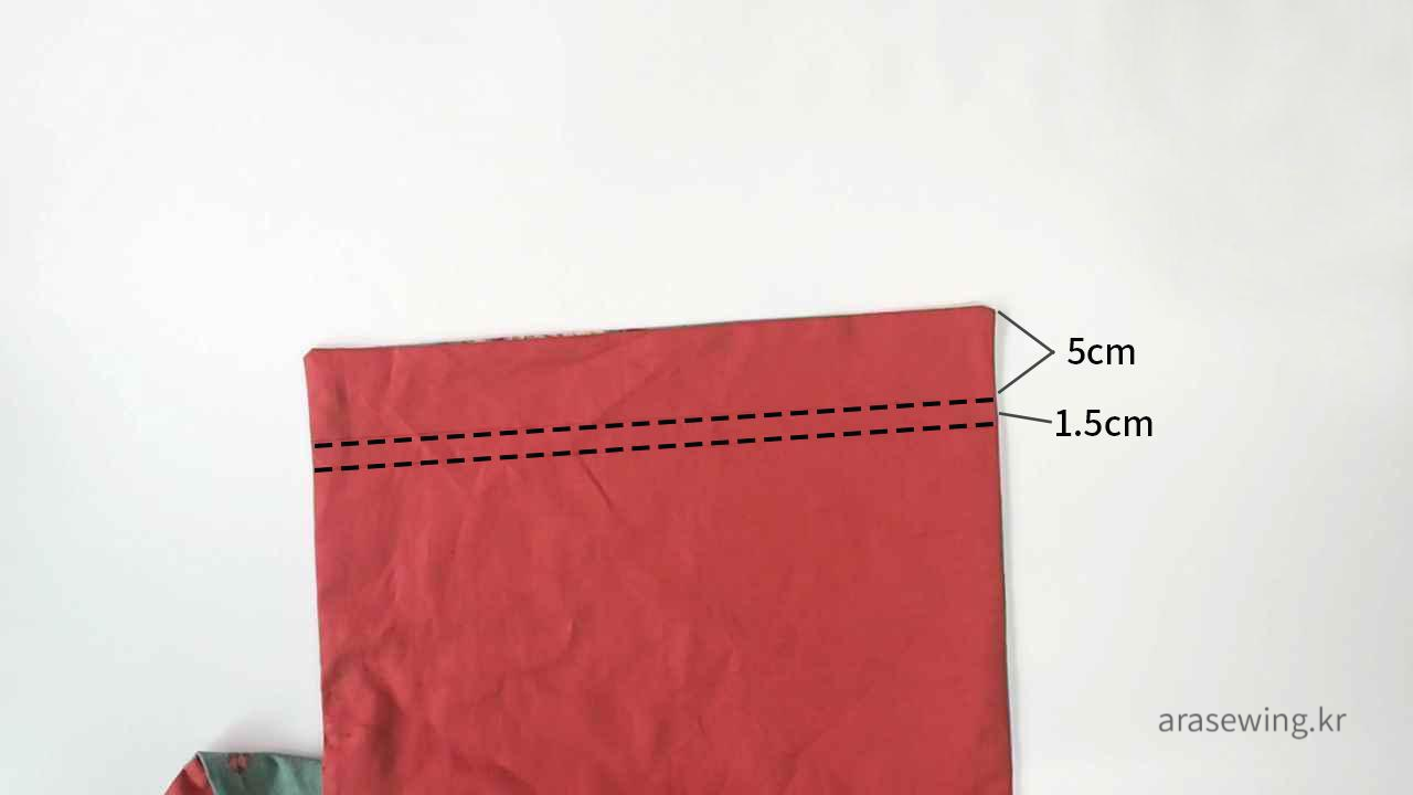 9. 겉감쪽에서 반으로 접어서 잘 맞춘 후에 양 옆을 스트링 구멍 위치까지 박음질합니다.