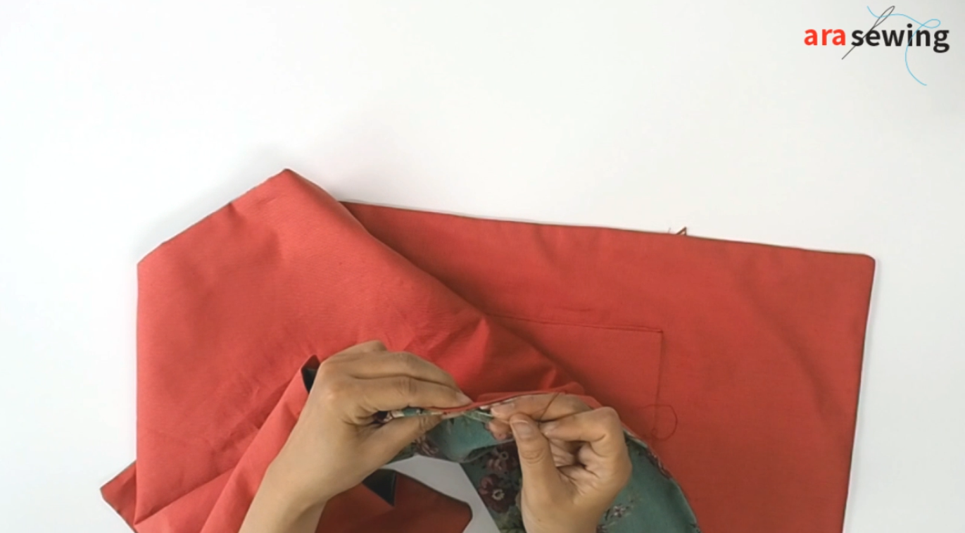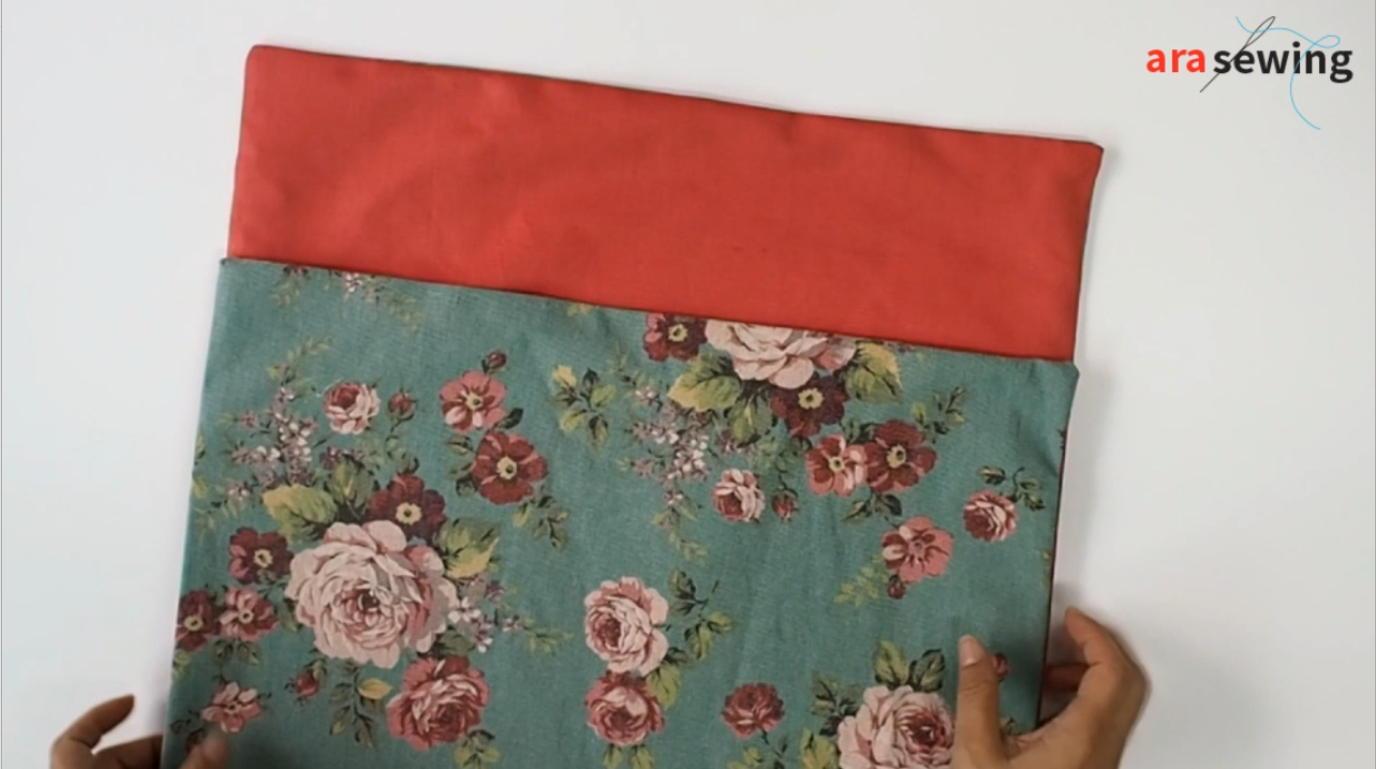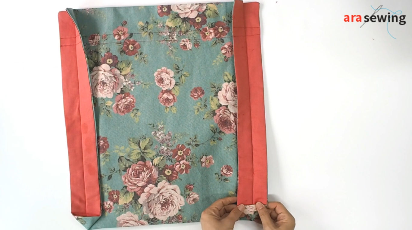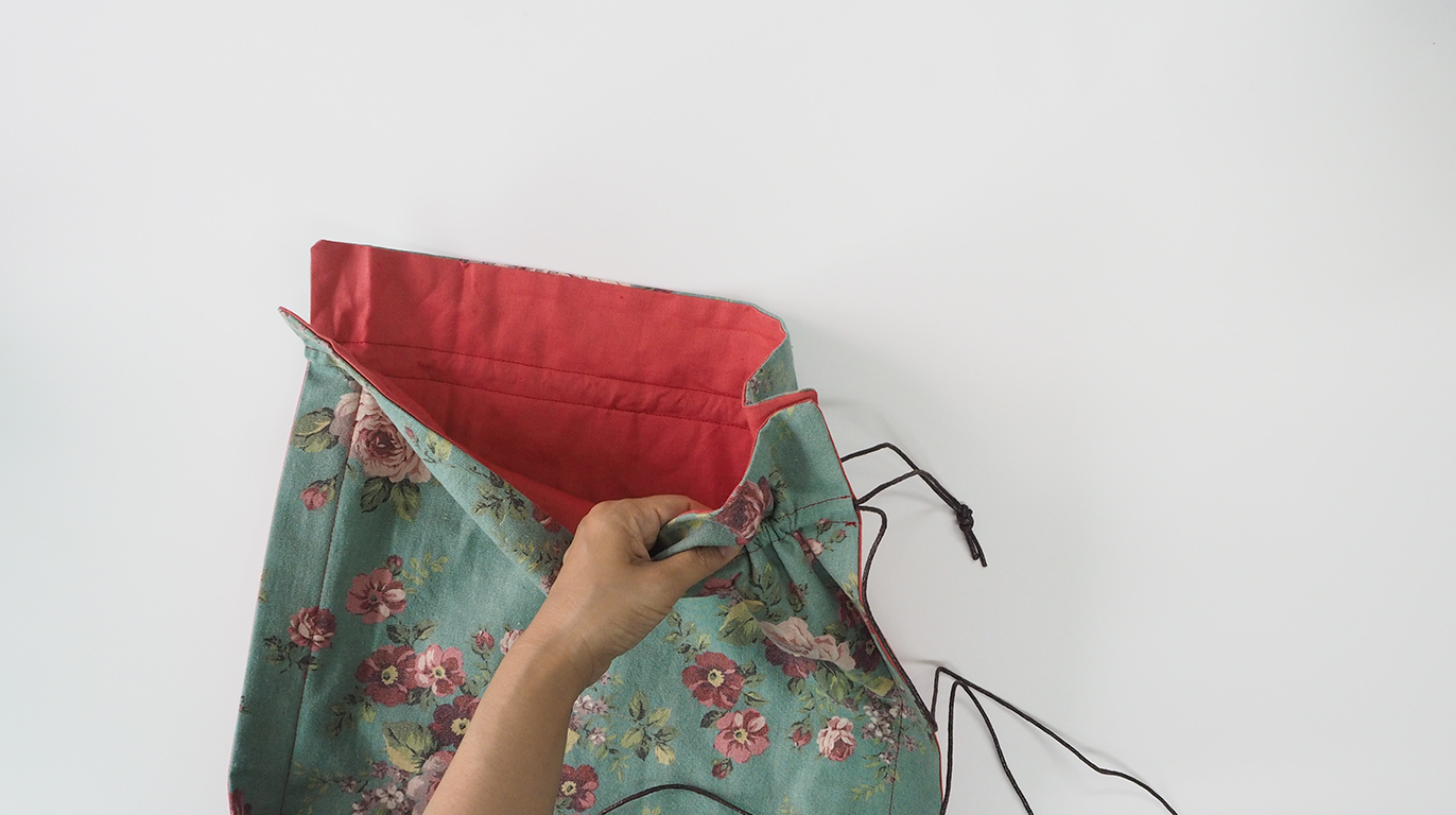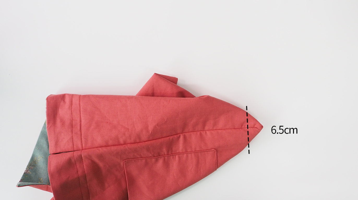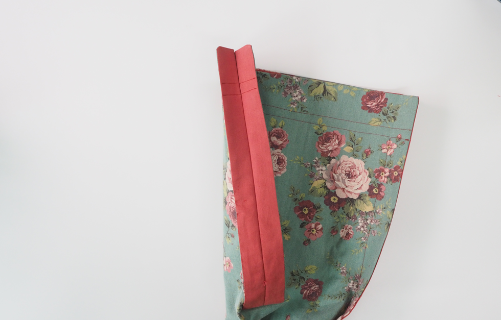 10. 옆선을 벌려서 잘 다림질한 후에 끝을 잘 잡고 안감이 보이게 뒤집습니다.