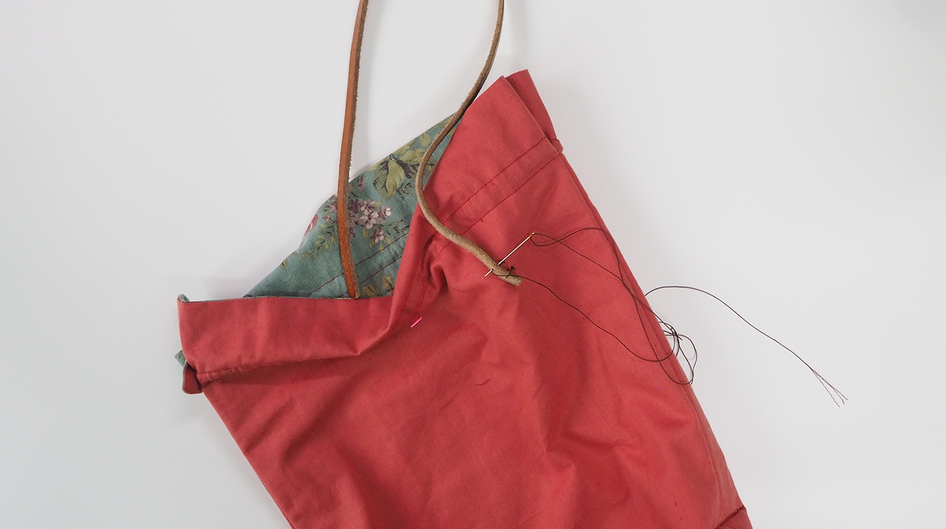 끈을 끼우고 가죽 핸들을 달아줍니다.