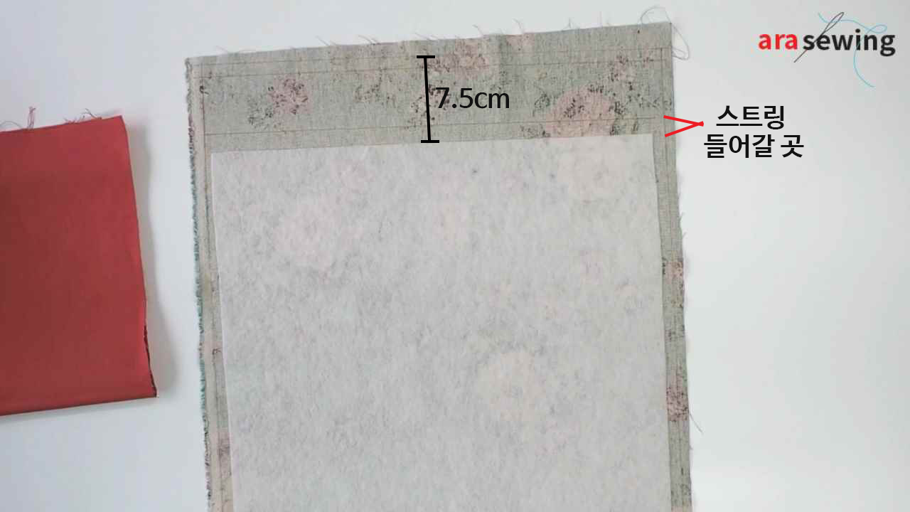 3. 겉감에 양끝에 7.5cm를 남겨두고 접착심지를 붙입니다. (가방 위에 프릴처럼 여분 분량과, 스트링 이 들어갈 분량입니다. (스트링 들어갈 곳 분량 1.5cm)
