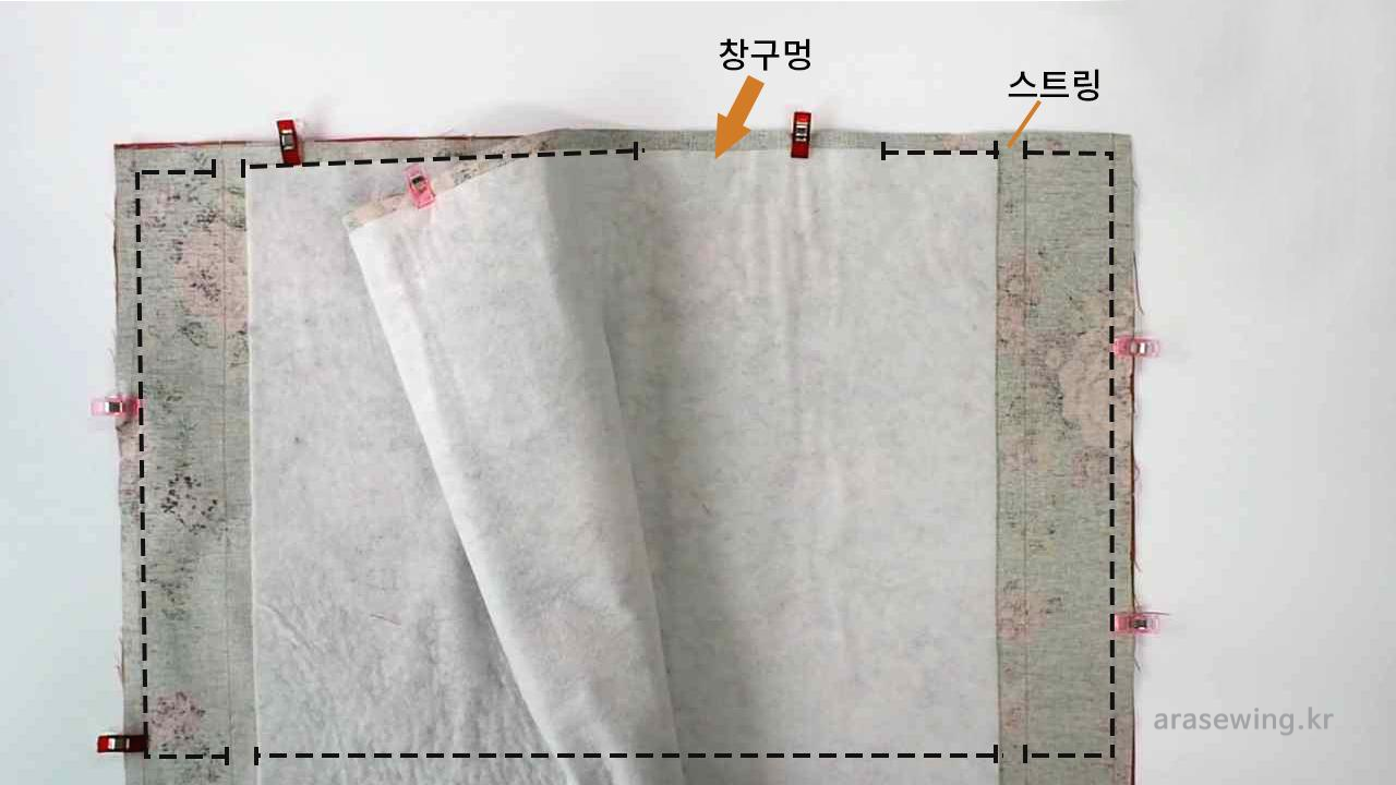 9. 겉감쪽에서 반으로 접어서 잘 맞춘 후에 양 옆을 스트링 구멍 위치까지 박음질합니다.