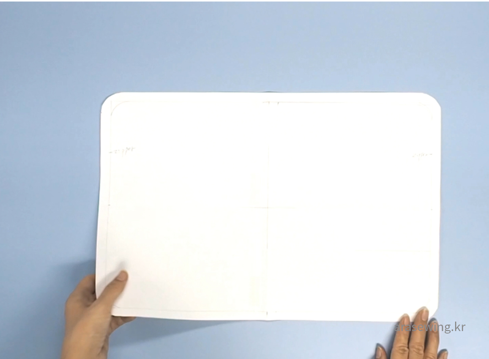 사이즈에 가로, 세로, 각 1cm를 여유분을 주어 패턴을 그린다.-시접은 사방 1cm / 지퍼 위치를 정하여 표시한다.
