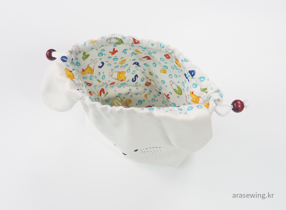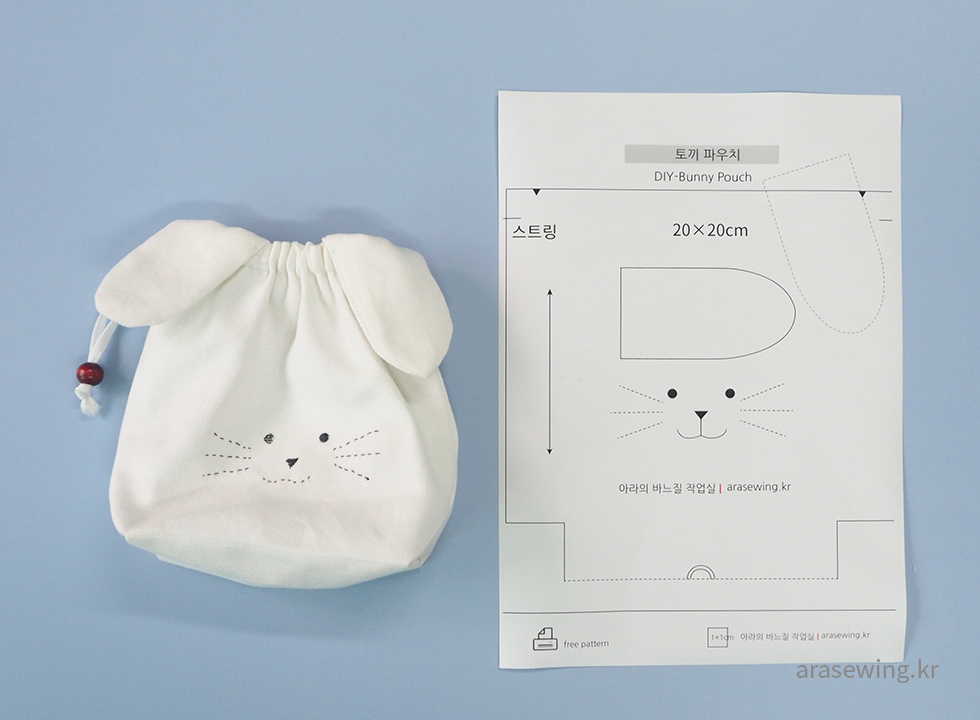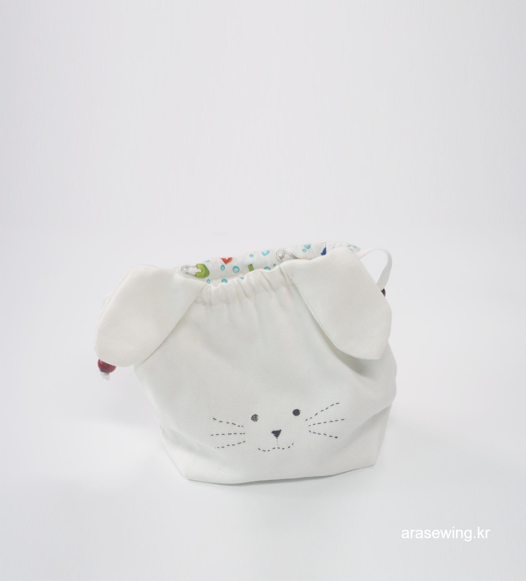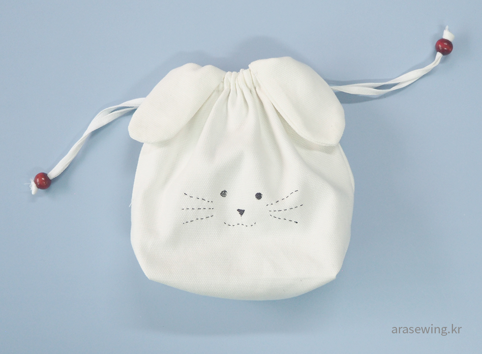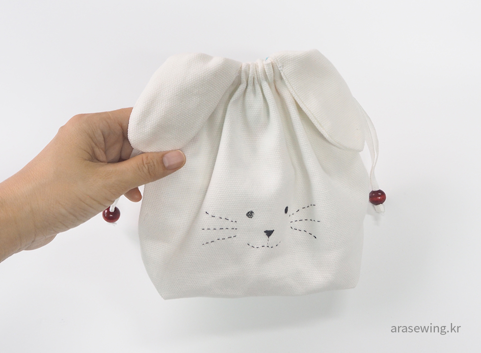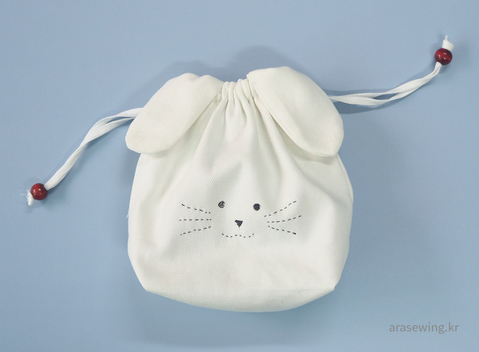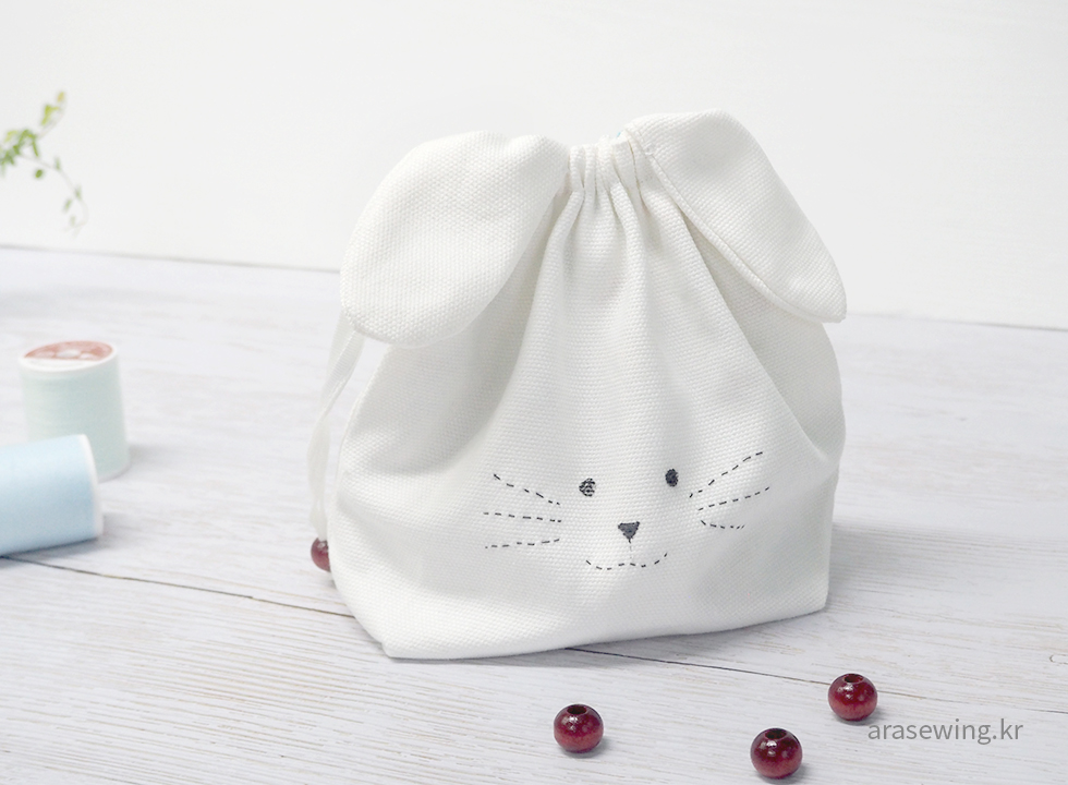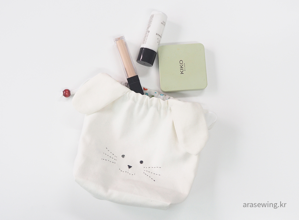 귀여운 파우치니까 사이즈는 작게, 심플하게... 감당할 수 있을지 모르지만 하얀 토끼가 생각나서 화이트 캔버스 원단을 집어 들었다. 토끼 하면 생각나는 귀. 음.. 귀를 똑바로 달았더니 스트링을 당겼을 때 울상이 되어버렸다. 그래서 귀 모양을 옆으로 비스듬히 끼우니 스트링을 조였을 때 쫑긋~ 하는 토끼. 나의 사랑스러운 파우치.