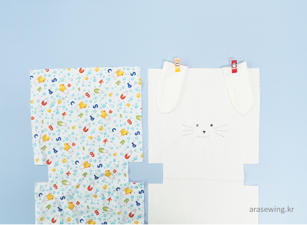 귀 모양을 만들어서 비스듬히 박음질로 고정합니다. 패턴에 있는 그림을 옮긴 후에 토끼 모양을 수놓습니다.