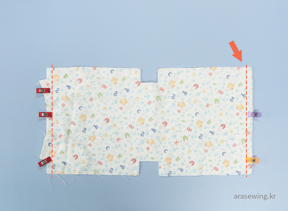 겉감과 안감을 마주 보게 하고 양 끝을 박음질합니다.