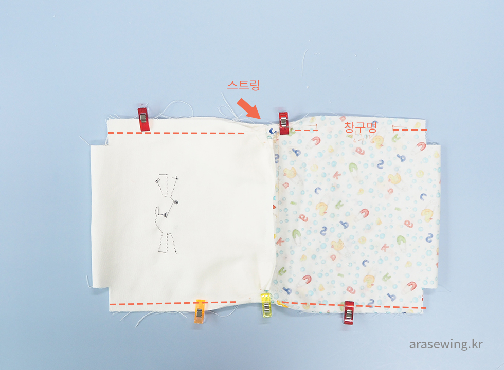 스트링 위치와 창구멍을 남기고 옆선을 박음질합니다.