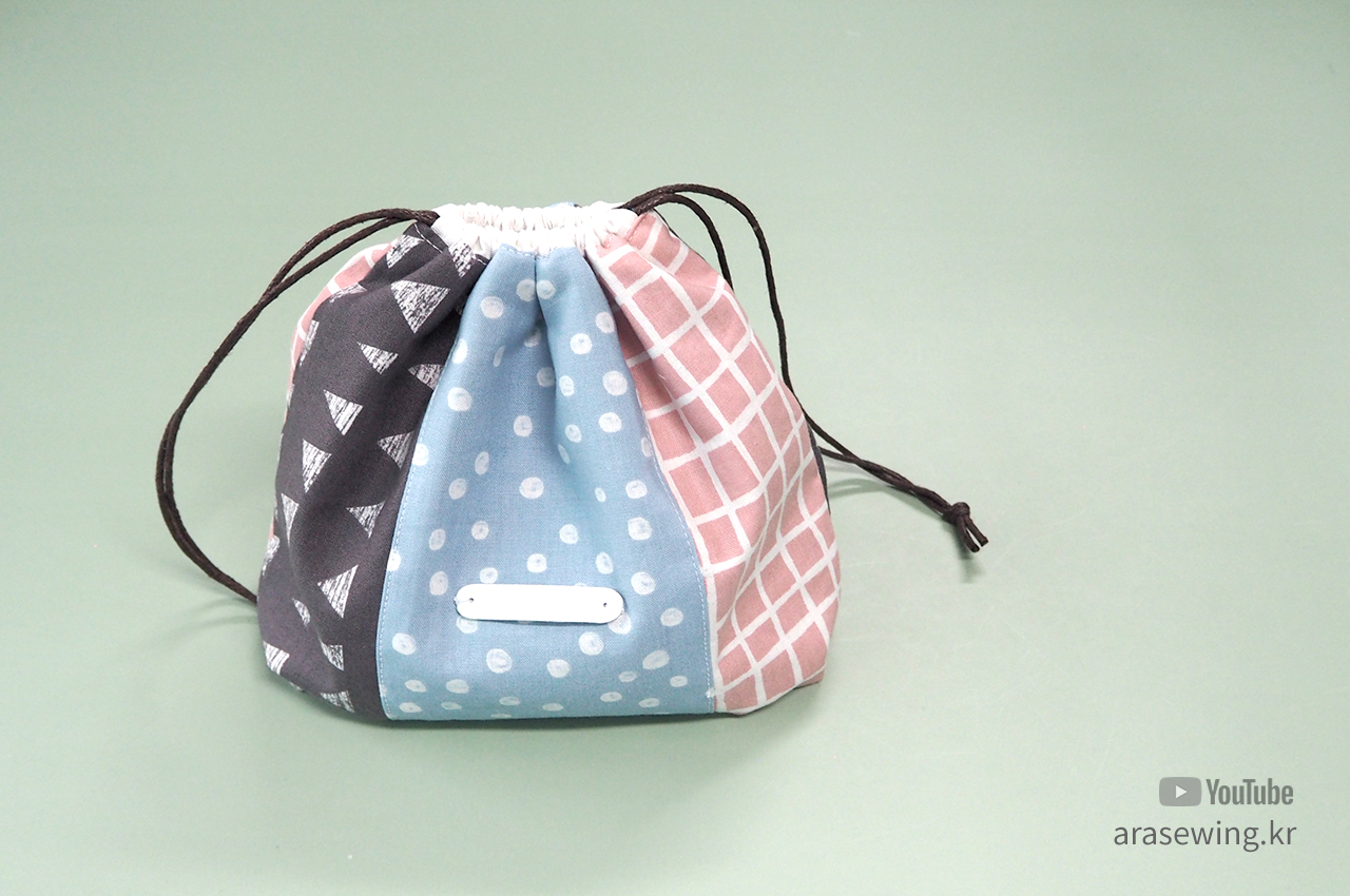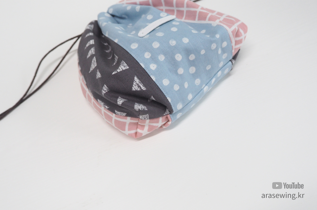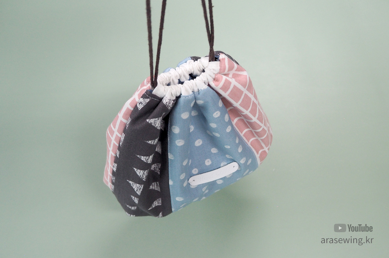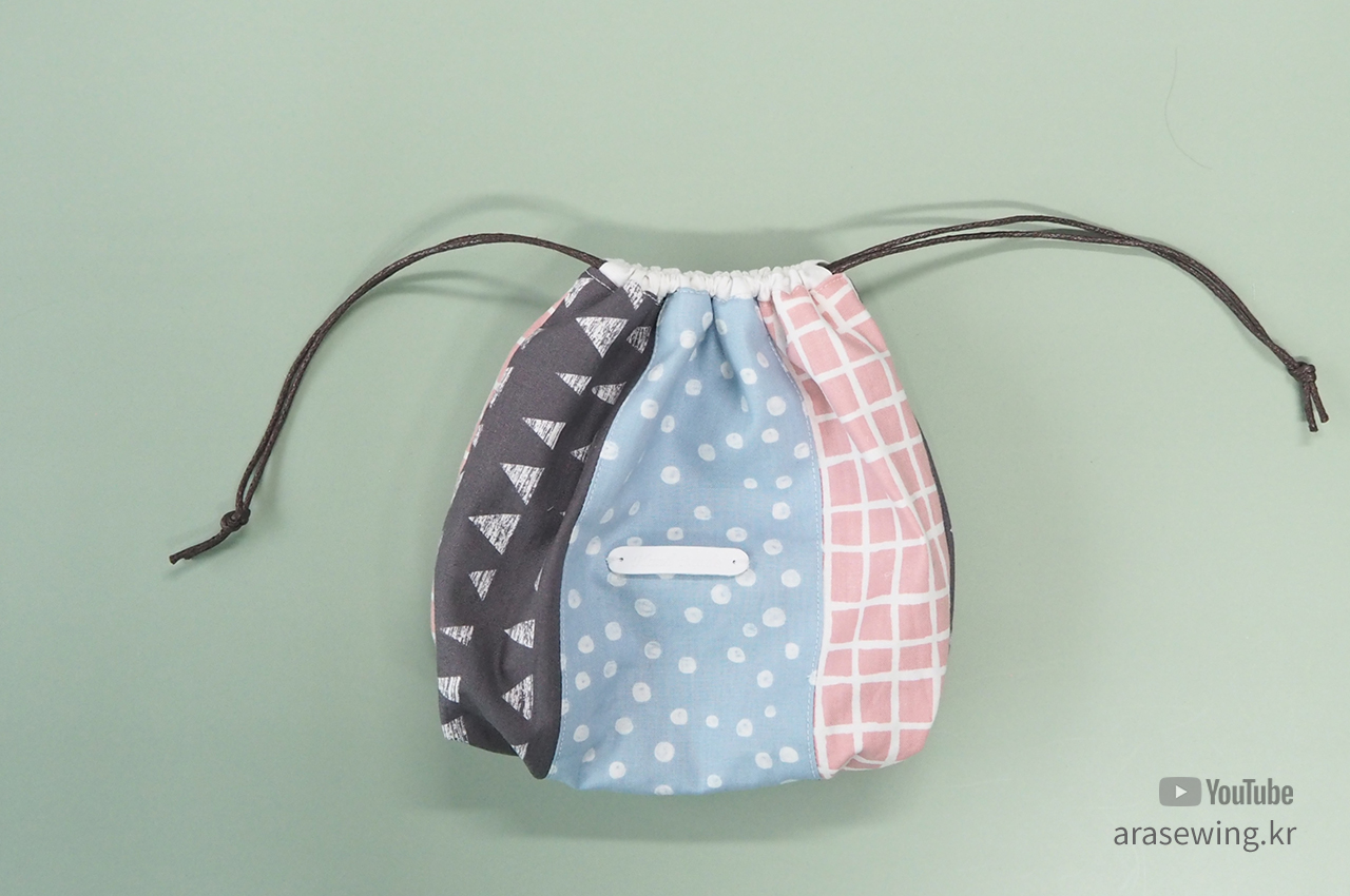 바느질 초보들한테 필수 코너인 스트링 파우치 만들기. 세 조각으로 연결했을 뿐이지 일반적인 파우치 만들기와 거의 과정이 같다. 다만 밑 바닥 부분에 주름을 넣어서 약간 볼륨감을 주려고 했는데 그다지 드라마틱하지는 않다. 새로운 시도를 한다는데 재미를 느낀 정도... 다용도로 쓰이는 적당한 크기의 파우치다.
