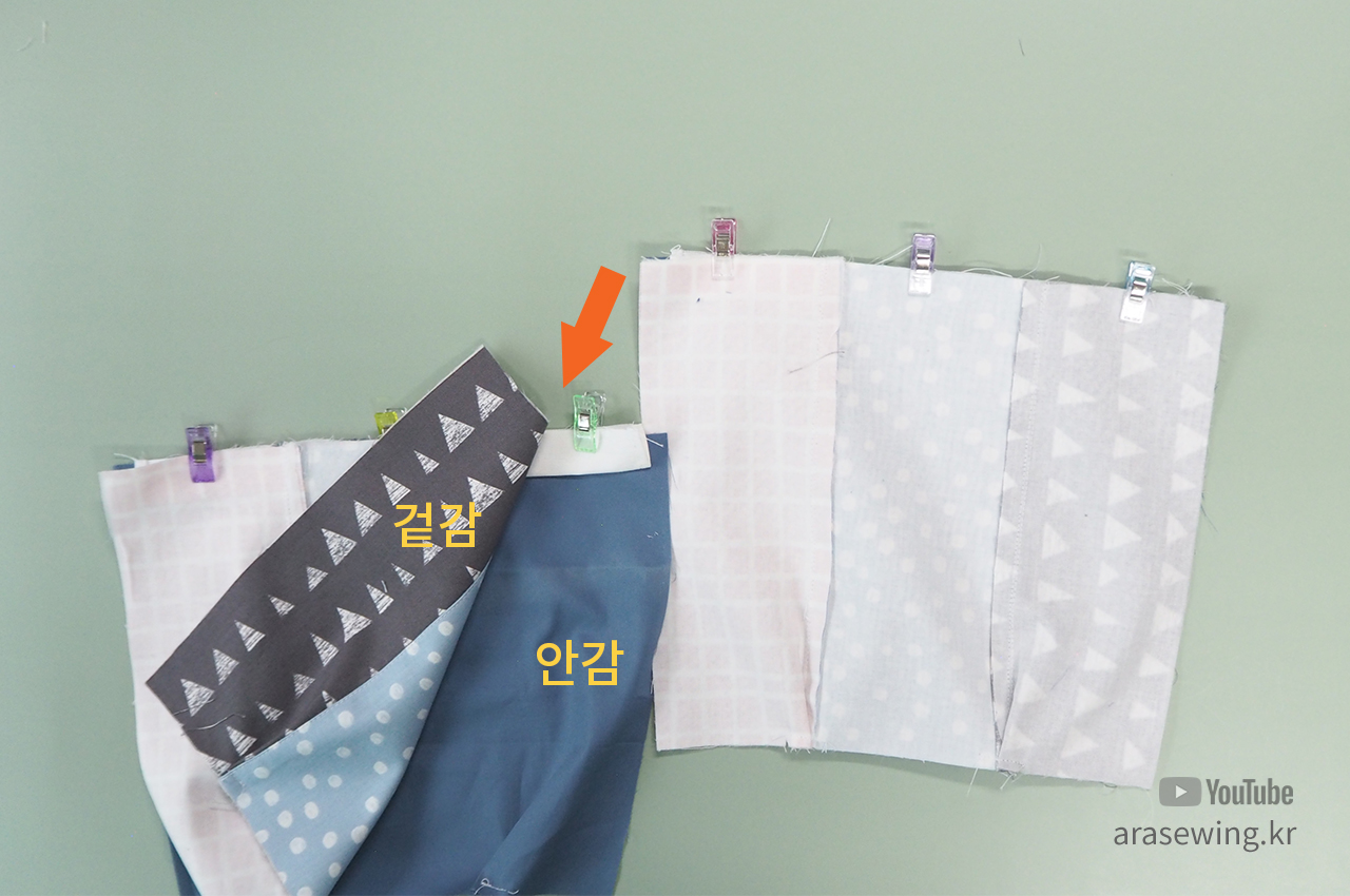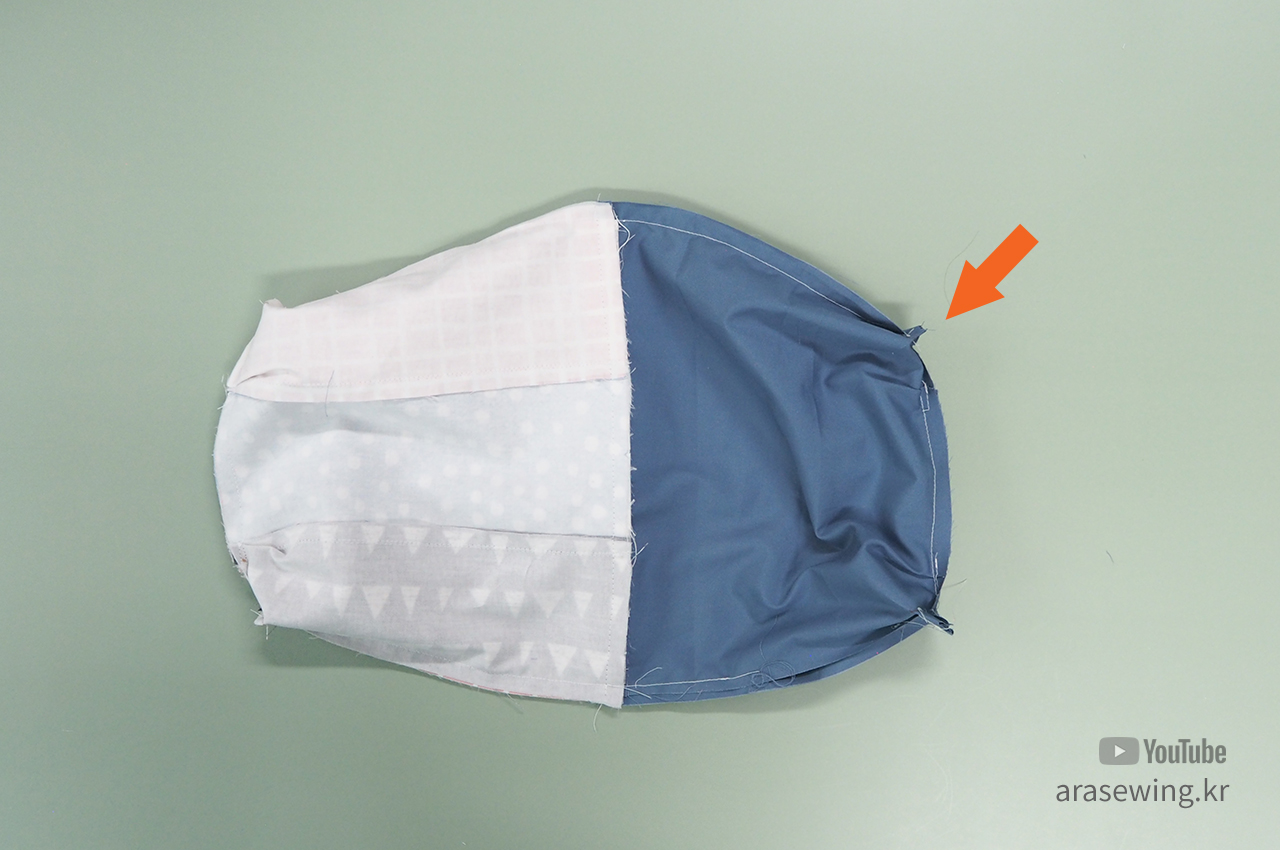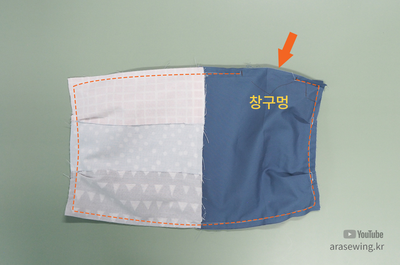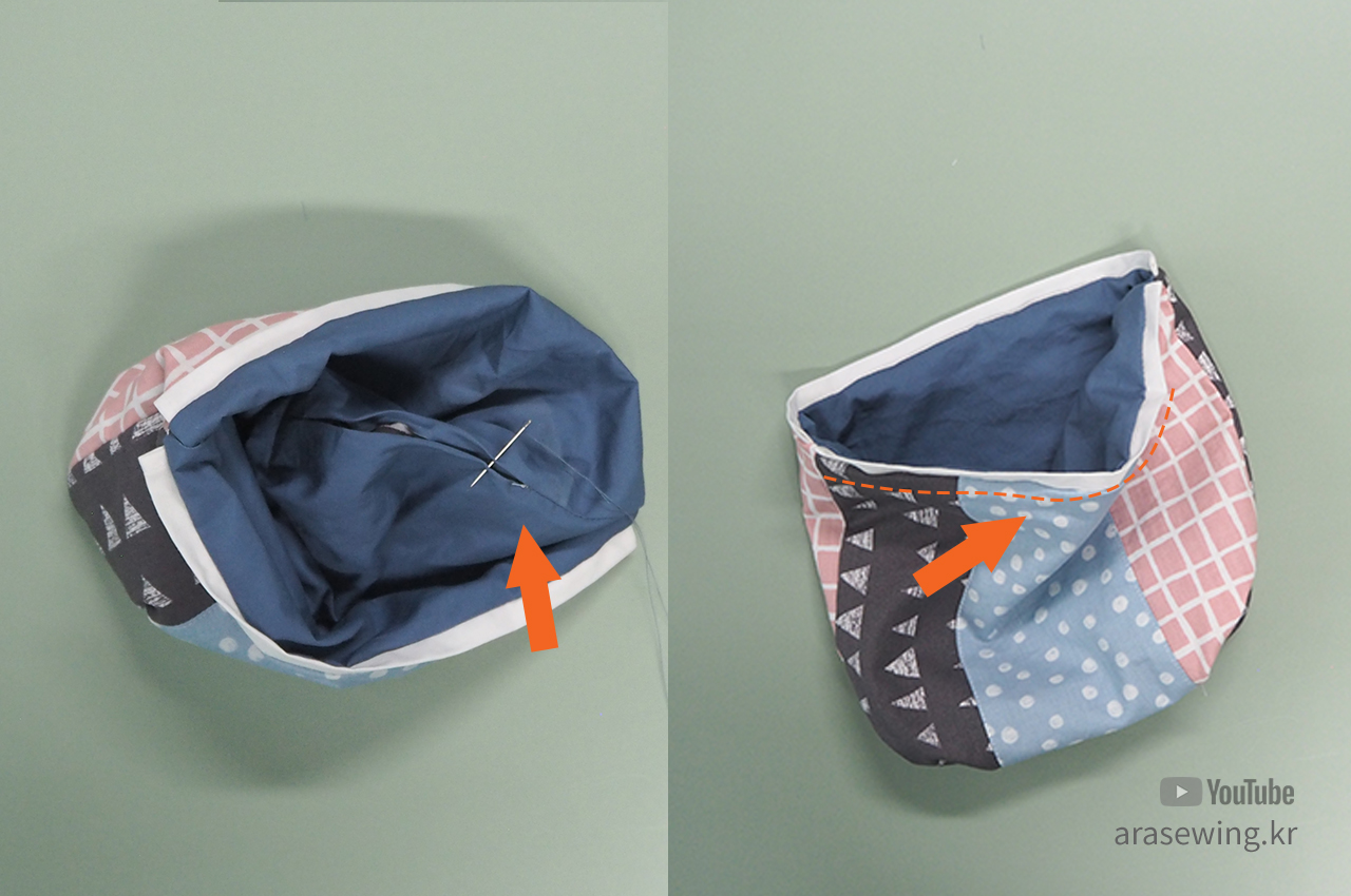겉감끼리, 안감끼리 마주 대고, 안감 쪽에 창구멍을 남기고 전체를 박음질합니다.