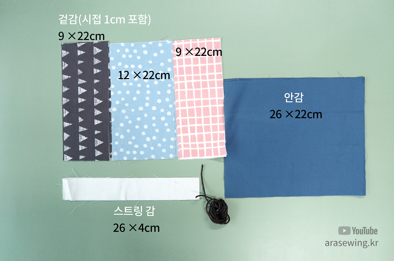 겉감의 겉과 안감의 겉 사이에 스트링 원단을 넣고 박음질합니다.