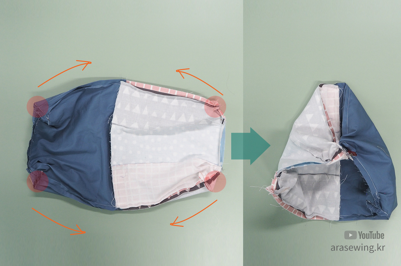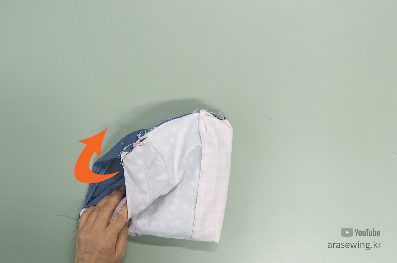 겉감끼리, 안감끼리 마주 대고, 안감 쪽에 창구멍을 남기고 전체를 박음질합니다.