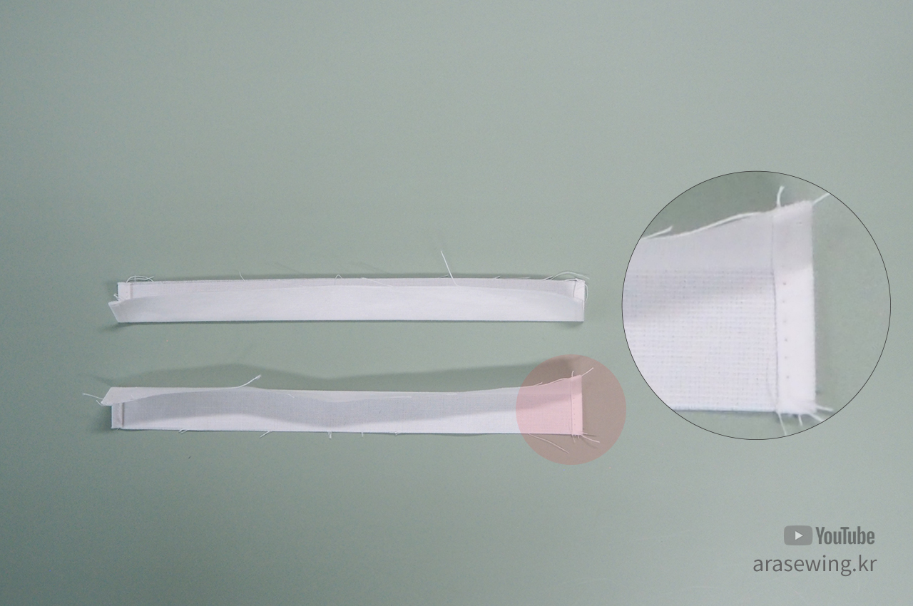 겉감의 겉과 안감의 겉 사이에 스트링 원단을 넣고 박음질합니다.