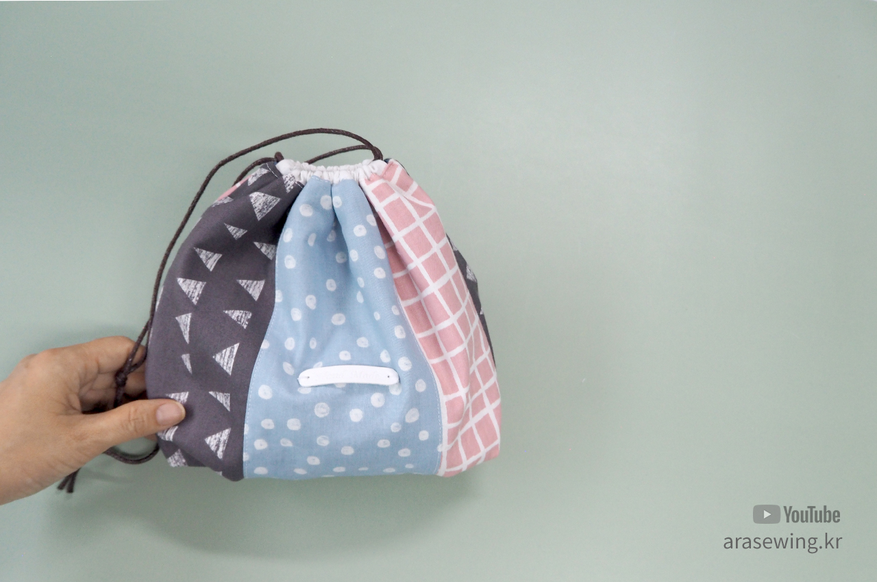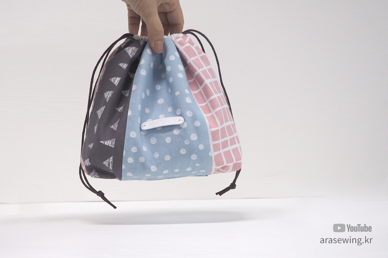 바느질 초보들한테 필수 코너인 스트링 파우치 만들기. 세 조각으로 연결했을 뿐이지 일반적인 파우치 만들기와 거의 과정이 같다. 다만 밑 바닥 부분에 주름을 넣어서 약간 볼륨감을 주려고 했는데 그다지 드라마틱하지는 않다. 새로운 시도를 한다는데 재미를 느낀 정도... 다용도로 쓰이는 적당한 크기의 파우치다.