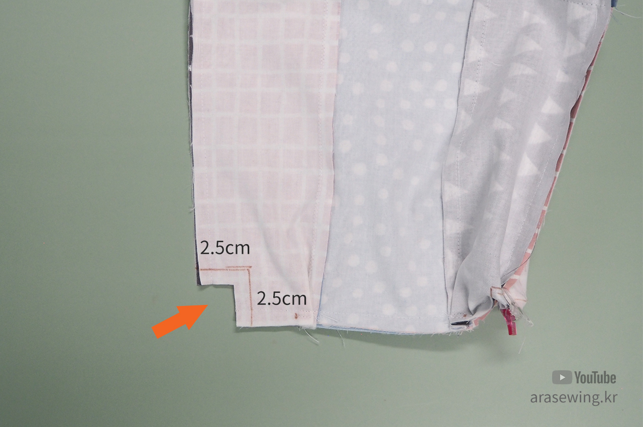 절개선 옆으로 2cm 옆으로 주름 분량을 표시합니다.