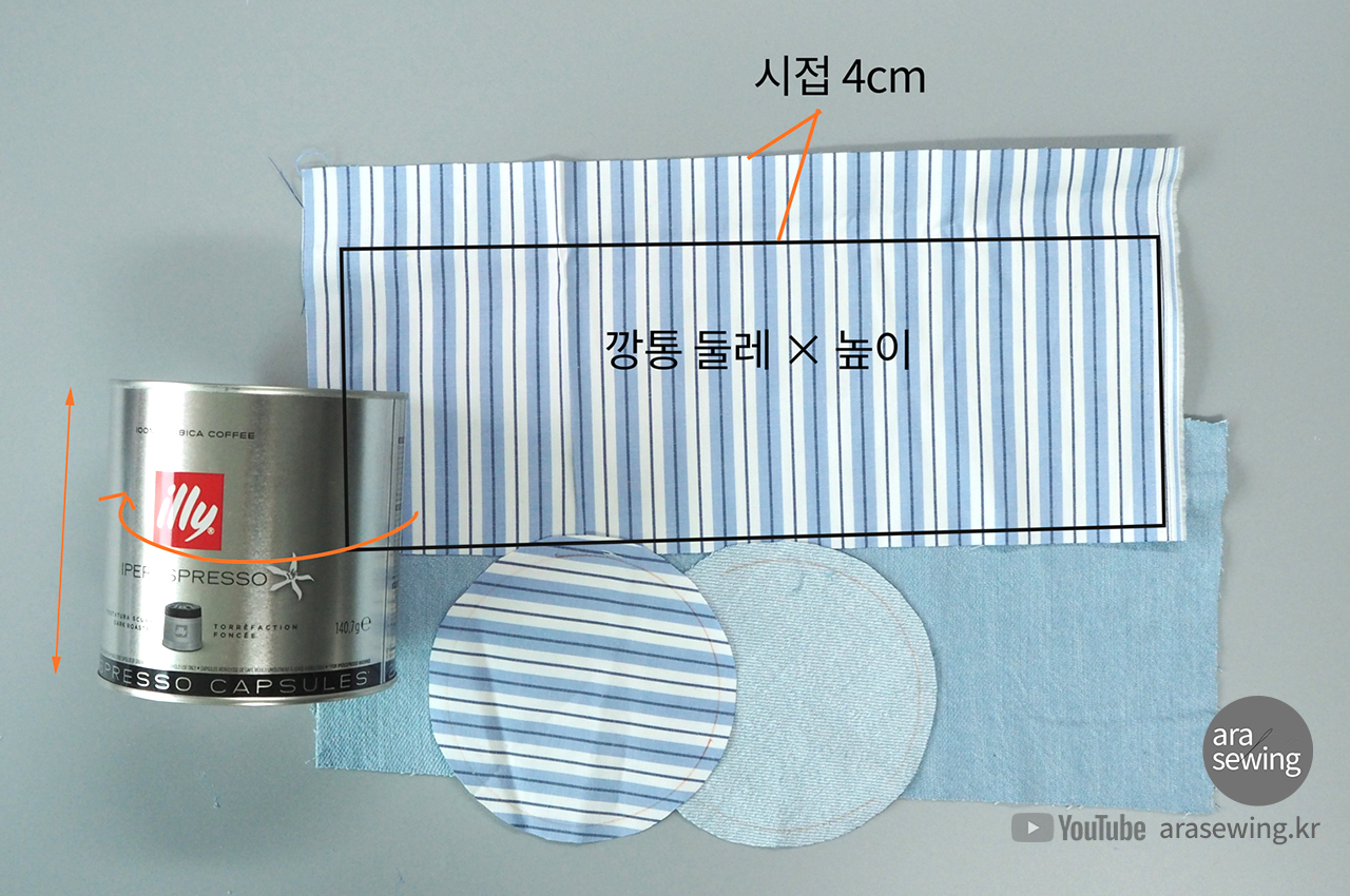 깡통 둘레에 옆선과 밑은 시접 1cm를 주고 윗면은 4cm를 추가로 주고 재단합니다.