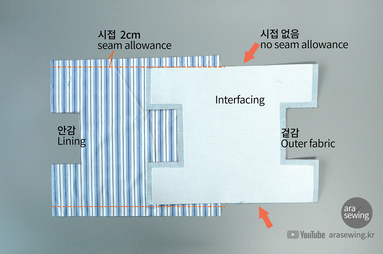 겉감은 위아래에 시접이 없게 재단을 하고, 안감은 위아래에 2cm 시접을 둡니다. 나중에 안감으로 겉감을 싸는 형태라서 안감의 시접을 더 주고 겉감은 시접을 없앱니다.