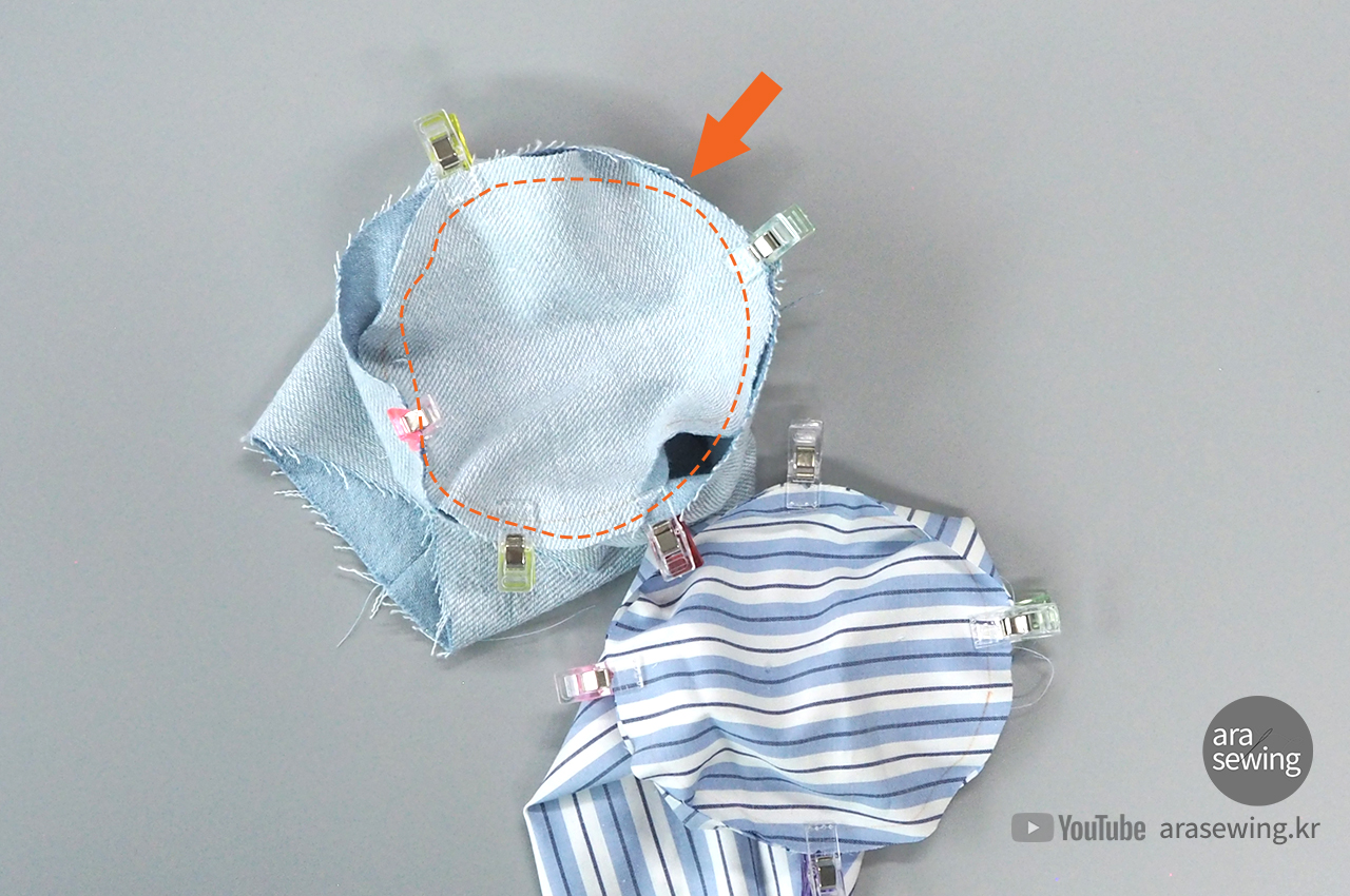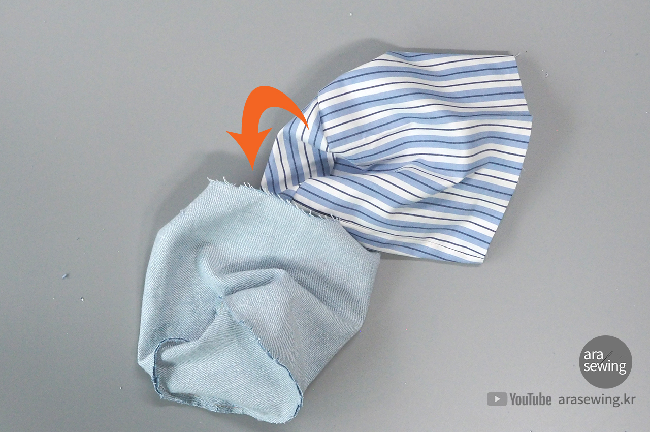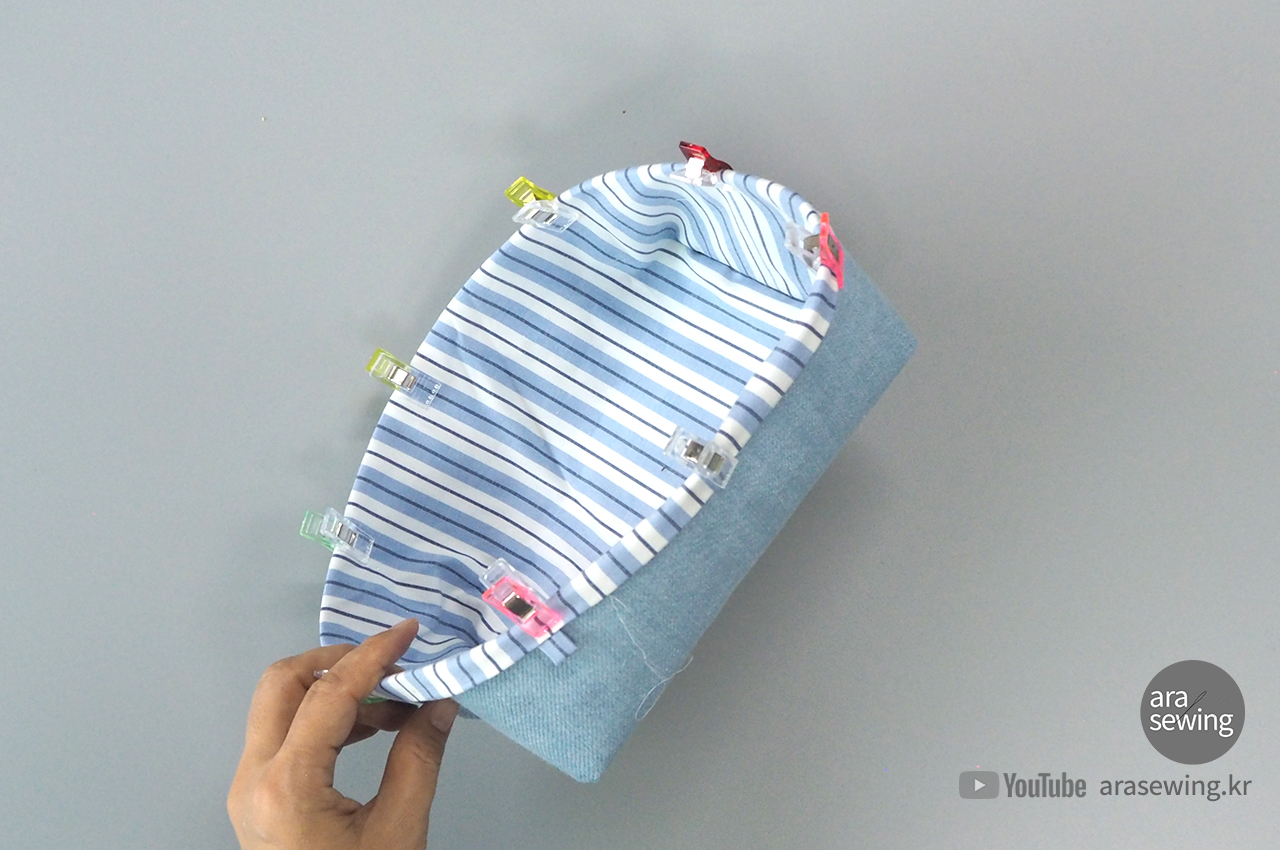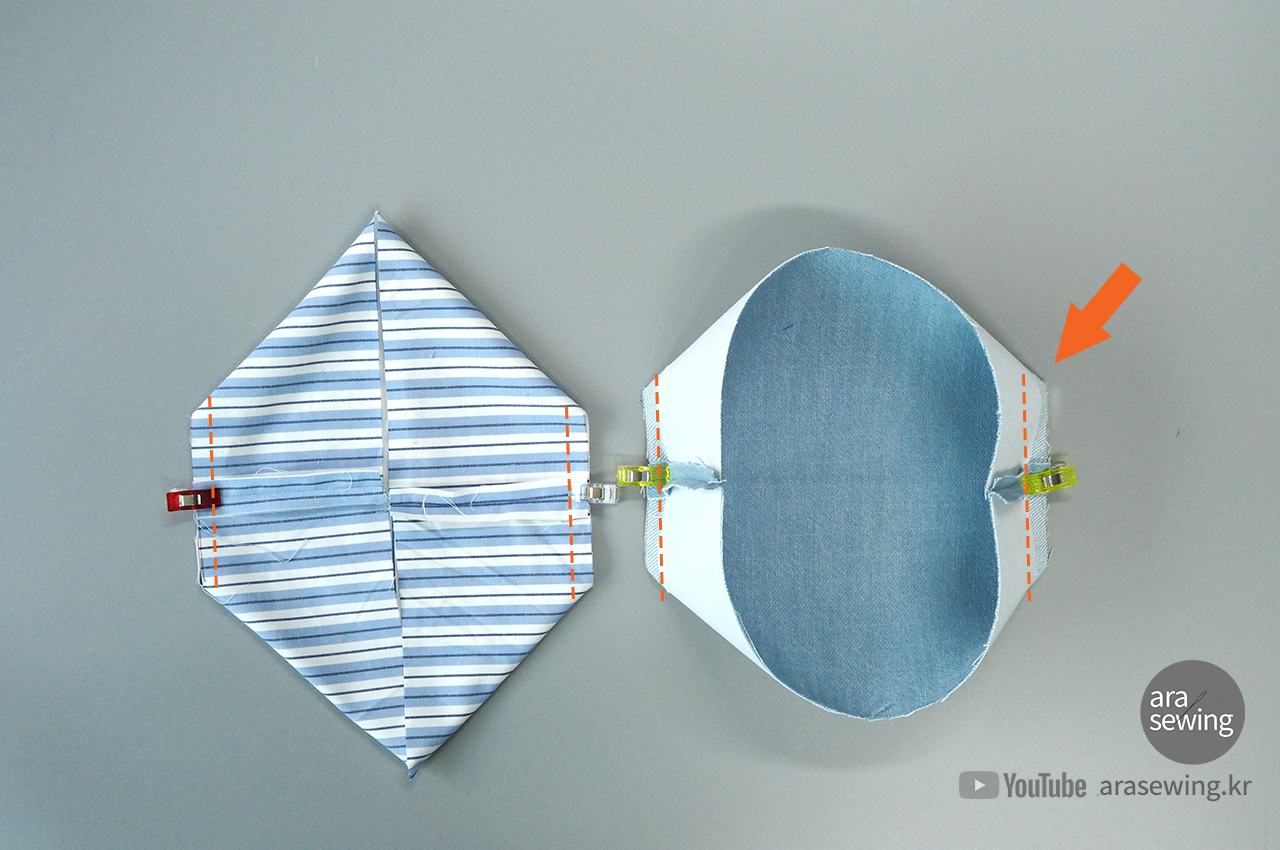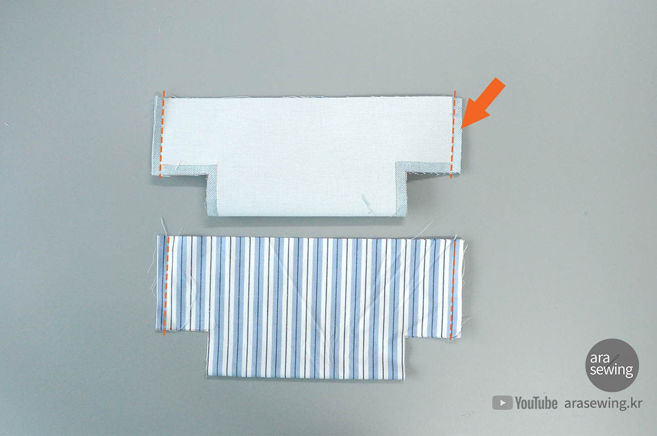 겉감, 안감을 각각 반으로 접어서 양 옆선을 박음질합니다.