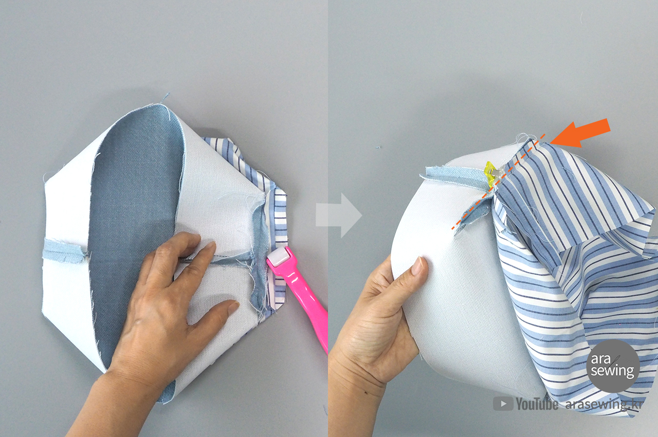 겉감과 안감을 고정하기 위해 시접을 가름솔로 정리하고 밑바닥끼리 대고 시접을 박음질로 고정합니다.