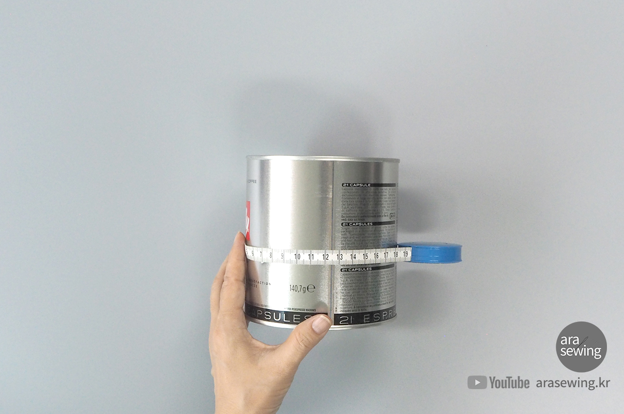 깡통 둘레에 옆선과 밑은 시접 1cm를 주고 윗면은 4cm를 추가로 주고 재단합니다.