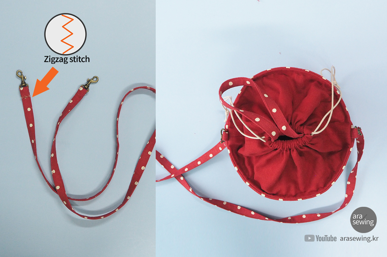 가방끈을 만들어 좁은 지그재그 스티치로 박음질합니다.