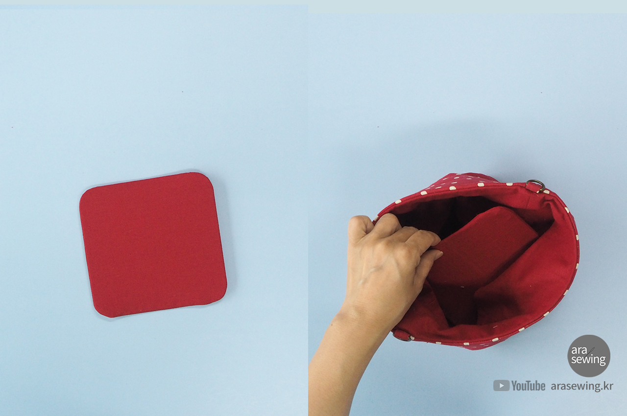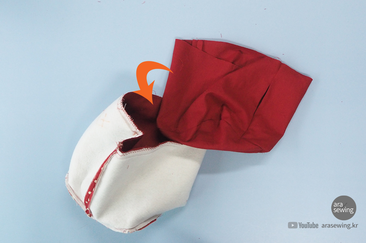 만들어 놓은 안감을 뒤집어서 겉이 나오게 한 후에 겉감의 겉과 마주 보게 겉감 속에 넣습니다.