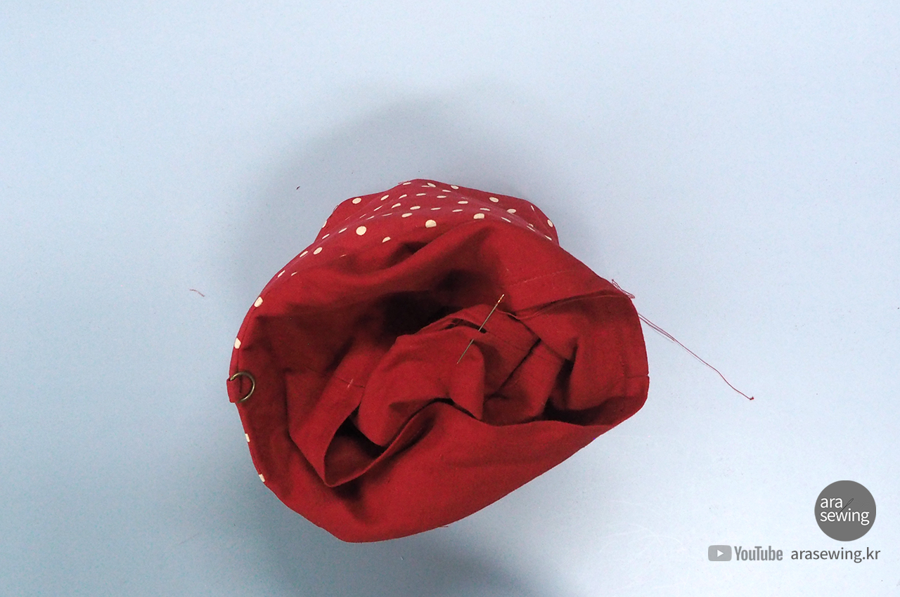 스트링 들어갈 부분 원단 2장을 겉끼리 대고 옆선에 스트링이 들어갈 구멍을 남기고 박음질합니다.