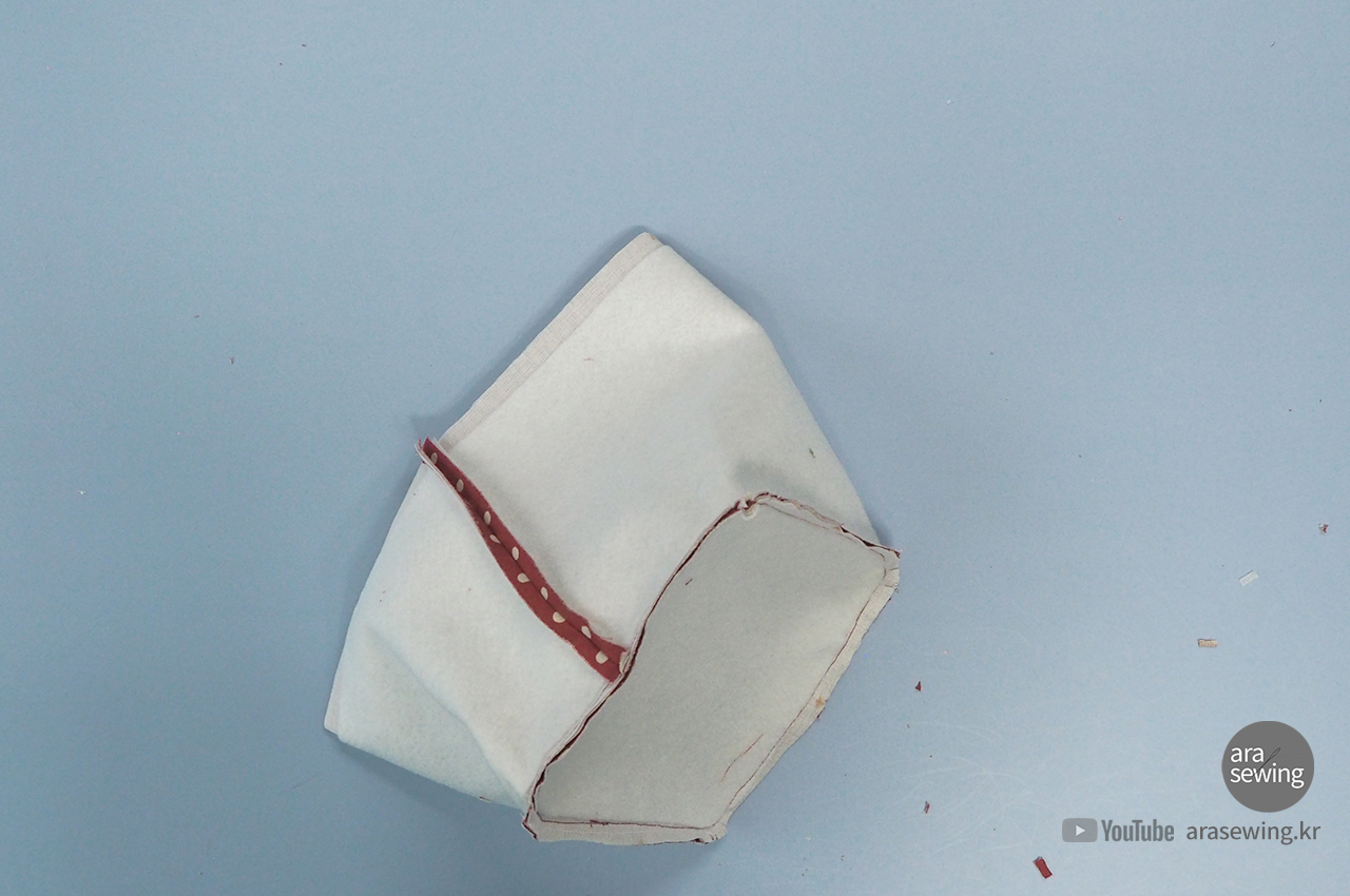 안감 몸통에 바닥을 연결해서 겉감과 똑같이 만듭니다. 이때 안감 몸통 옆선에 창구멍을 냅니다.