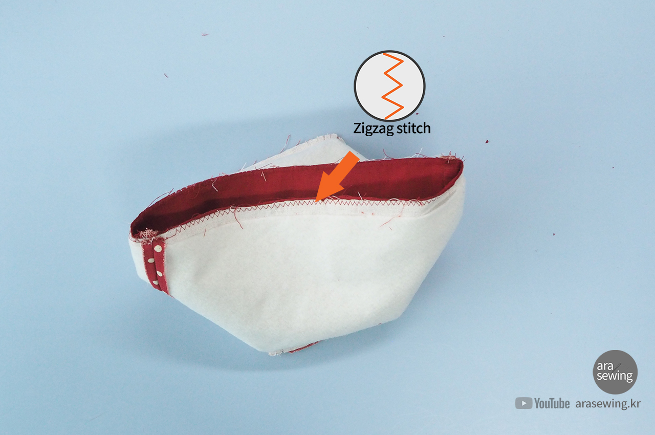 겉감의 몸통에 겹쳐서 넣은 후에 지그재그 스티치로 고정합니다.